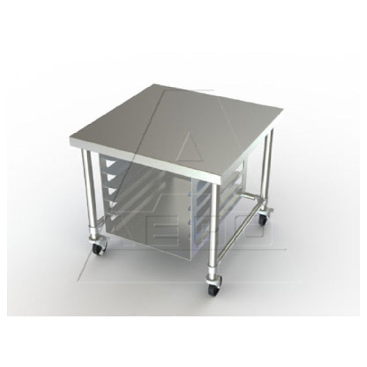 The AERO Manufacturing MMT-3030 Mobile Mixer Table is a versatile and robust solution designed for various industrial and culinary applications. Measuring 30 inches in width, 30 inches in depth, and 28 inches in height, this table provides a compact yet spacious surface for a range of operations. The table features a 14-gauge 300 series stainless steel top, known for its durability and resistance to corrosion, making it ideal for demanding environments. Its marine edges offer added safety and prevent spills, a crucial feature in settings that require stringent cleanliness. Equipped with a stainless steel pan rack and reinforced by side and rear cross bracing, this table ensures stability and support for heavy mixers and equipment. Mobility is facilitated by four-inch swivel casters, with two locking to secure the table in place during use. Fully welded gussets enhance its structural integrity, while sound deadening design elements contribute to a quieter operation. Shipped KD (knocked down) for easy transport and assembly, the AERO Manufacturing MMT-3030 Mobile Mixer Table is engineered to meet the diverse needs of industries ranging from food service to manufacturing, offering a blend of practicality and reliability.