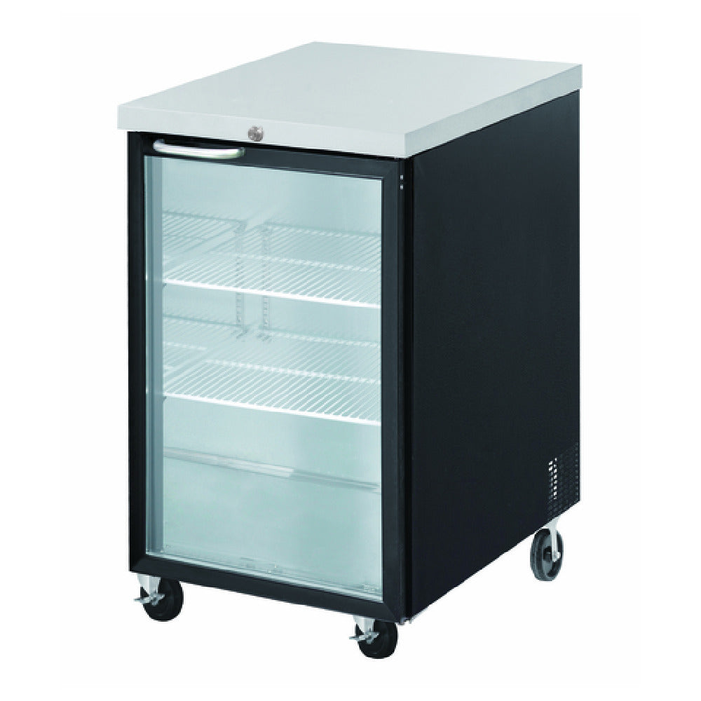 The Akita AGBB-23 Back Bar Cooler One-section 23-43/100"W is a highly efficient refrigeration solution designed for various commercial environments. With a width of 23-43/100", this single-section unit features a rear-mounted self-contained refrigeration system, ensuring optimal cooling performance while maintaining a compact footprint. The unit's top is constructed from durable stainless steel, complemented by a black laminated exterior, offering a sleek and professional appearance suitable for any setting. Equipped with one glass door that includes a lock and recessed handle, it provides both security and easy access to stored items. Inside, the cooler boasts a galvanized steel interior with a stainless steel floor for enhanced durability, along with two adjustable shelves to accommodate various storage needs. The unit is mounted on 4"H swivel casters, two of which are braked for stability. Utilizing R290 Hydrocarbon refrigerant, it operates with an energy-efficient 1/5 HP motor, running on a 115v/60/1-ph power supply drawing 3.0 amps, and is connected via a NEMA 5-15P plug. Certified by cETLus and NSF, this cooler meets rigorous safety and sanitation standards, making it an ideal choice for restaurants, bars, and hospitality venues that require reliable and efficient beverage storage.