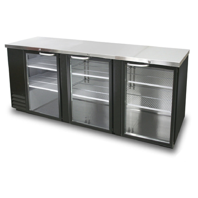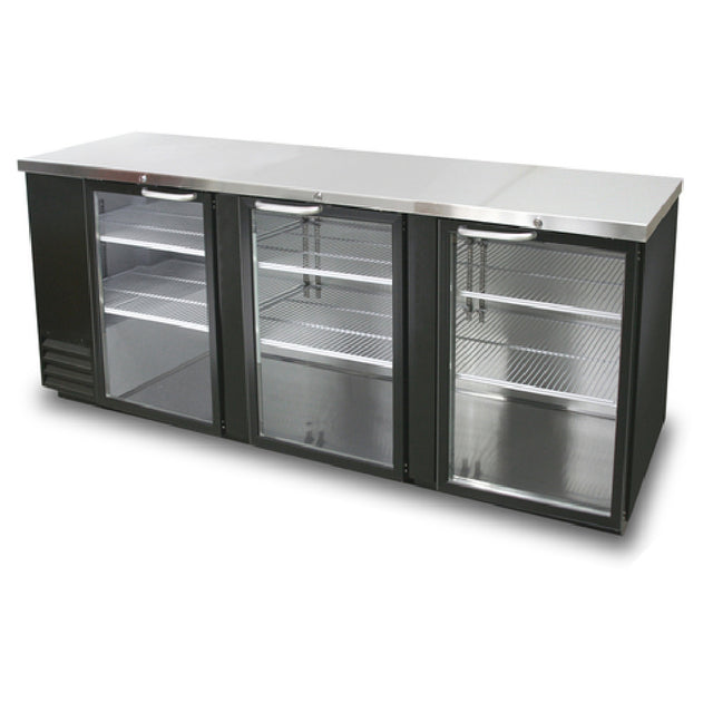 The Akita AGBB-90 Back Bar Cooler Three-section 90-35/100"W is an expertly engineered refrigeration solution ideal for hospitality and food service industries that require reliable and efficient cooling. This back bar cooler features a three-section design with a total width of 90-35/100 inches, accommodating various storage needs. It comes equipped with side-mounted self-contained refrigeration, utilizing the eco-friendly R290 Hydrocarbon refrigerant. The stainless steel top and black laminated exterior not only provide durability but also enhance the aesthetic appeal, making it suitable for commercial bar settings. The unit includes three locking glass doors, ensuring both security and easy visibility of contents. Inside, six adjustable shelves offer customizable storage options, while the galvanized steel interior with a stainless steel floor ensures longevity and ease of maintenance. With a power specification of 3/8 HP, 115v/60/1-ph, and 3.5 amps, it operates efficiently and is compatible with standard electrical outlets, featuring a cord with NEMA 5-15P. Certified with cETLus and NSF, this cooler meets strict safety and sanitation standards, making it a dependable choice for businesses seeking a robust and versatile refrigeration unit that seamlessly blends form and function.