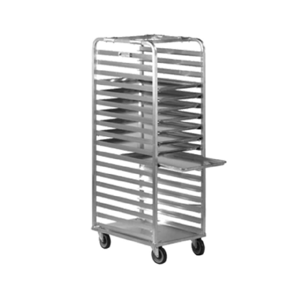 The Alexander Industries R-401 Roll In Refrigerator Rack is a robust and versatile storage solution, specifically designed to optimize space and efficiency in professional kitchen environments. Standing at a height of 63 inches with dimensions of 26 inches in depth and 20-1/2 inches in width, this mobile rack is engineered to accommodate a capacity of nineteen 18 by 26-inch bun pans, making it an ideal choice for bakeries and foodservice operations seeking organized storage of multiple trays. The rack features a solid bottom and open sides, facilitating easy access and cleaning. With 3-inch slide spacing, it ensures optimal air circulation around stored items. The R-401's structure is reinforced with square aluminum uprights, providing excellent durability and stability. Its end-loading design enhances functionality by allowing seamless loading and unloading of trays. Equipped with 5-inch diameter non-marking swivel casters, this rack can be effortlessly maneuvered across the kitchen floor, minimizing the risk of surface damage. Arriving fully assembled, it ensures immediate usability. Certified by NSF, the Alexander Industries R-401 adheres to stringent public health and safety standards, making it a reliable asset for any food service establishment prioritizing hygiene and efficiency in their storage solutions.