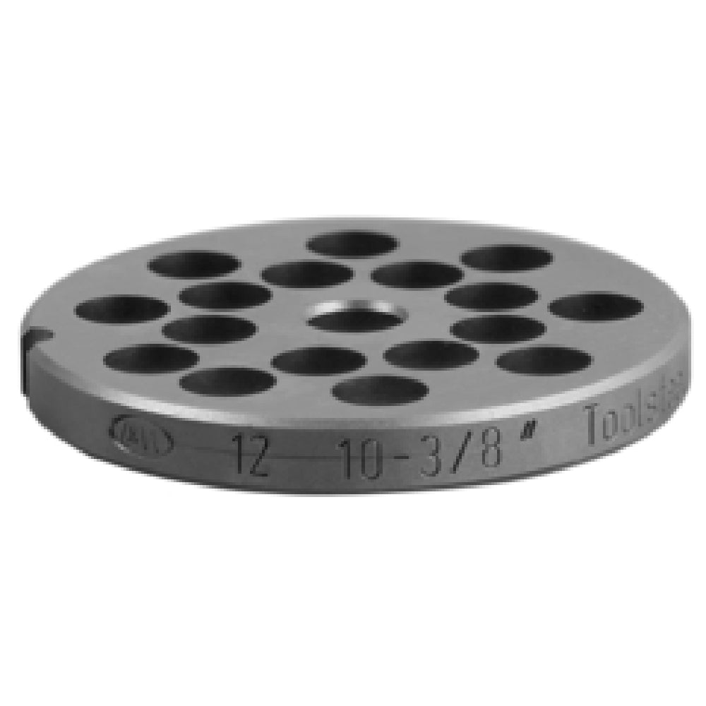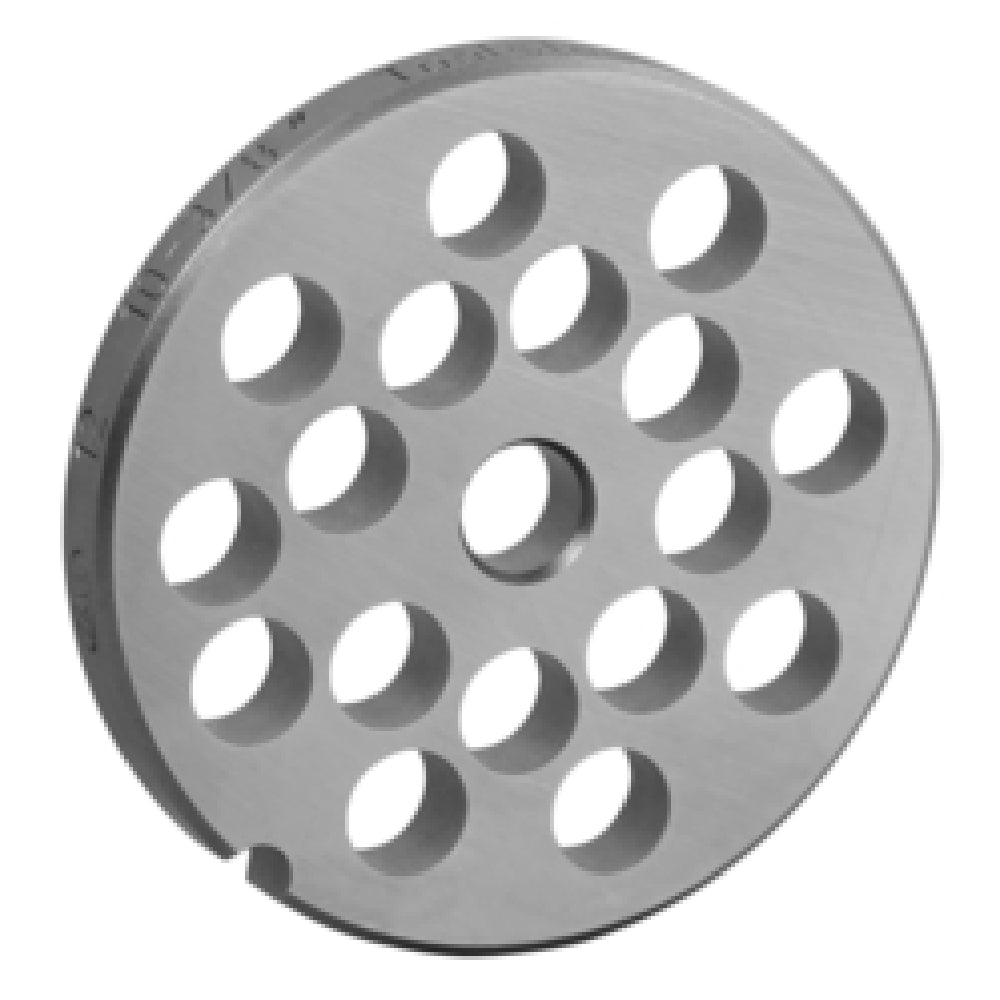 The Alfa 12 3/8 HBLS L & W Chopper Plate Hub Size 123/8" Hole Size is a precision-engineered component, designed for high-performance meat processing applications. This chopper plate features a hub size of 12 and a 3/8" hole size, offering versatility and efficiency in cutting operations. It is crafted from chrome/vanadium alloy steel, a material renowned for its exceptional durability and resistance to wear, ensuring longevity even under rigorous usage. The maximum number of holes are meticulously drilled into the plate to enhance its processing capacity, making it suitable for high-demand environments. Manufactured in Germany, this product reflects the country’s reputation for engineering excellence and precision. The Alfa chopper plate serves as an ideal replacement for OEM 16426-1, promising compatibility and performance consistency. This makes it a valuable asset for different segment markets within the meat processing industry, including large-scale butcheries, meat packing plants, and commercial kitchens, which require reliable and efficient equipment to meet their operational demands.
