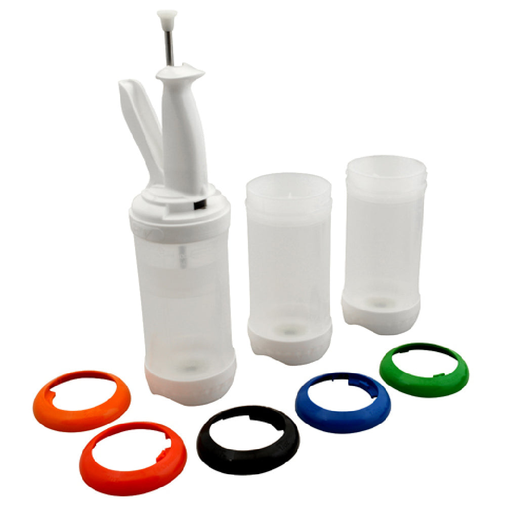 AllPoints 2801822 Portion Pal Portion Control Dispenser Starter Kit 16 Oz Kit, Capacity 16 Fl Oz 473 Ml, Country Of Origin Canada, Includes 3-cartridges 1-trigger 1-set Portion Control Rings, 5 Interchangeable Colored Portion Handle Rings, 1/4 1/3 1/2 3/4 1, Note Box Dimensions- 10" X 10" X 3-1/2", Weight 1.52 Lb