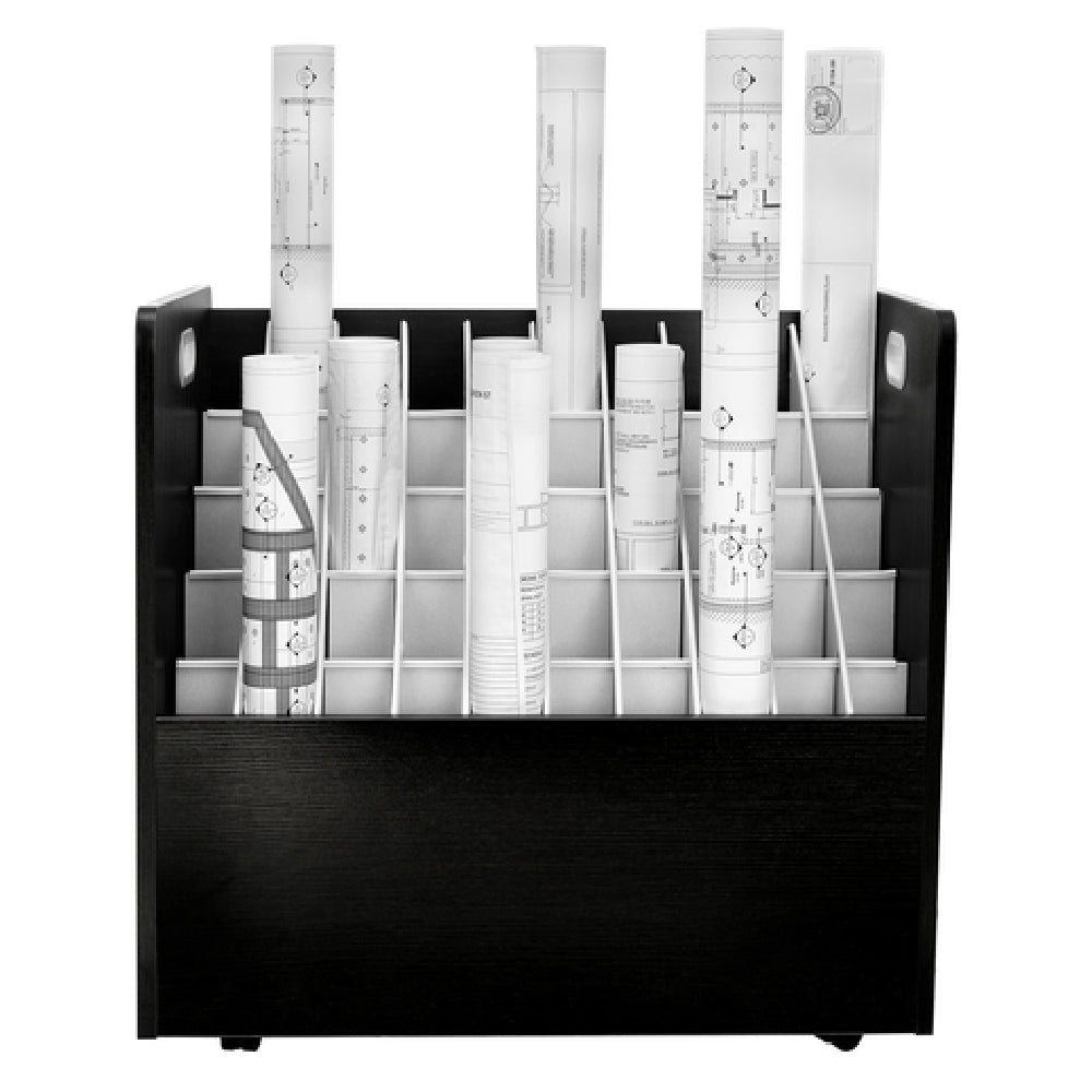 The Alpine Industries ADI626-BLK Blueprint Roll File/Large Document Organizer Mobile is a robust and efficient solution for organizing and storing large documents with precision. Featuring a sleek black finish, this mobile unit is crafted from high-quality wood, embodying both durability and a sophisticated aesthetic suitable for professional environments. The organizer boasts an impressive capacity with 50 individual slots, providing ample space for blueprints, architectural plans, or large format documents, making it an essential tool for architects, engineers, and design professionals who require systematic storage solutions. The mobility of this organizer is an added advantage, allowing for easy relocation within an office or studio space, thus enhancing accessibility and convenience. Its design is tailored to meet the needs of various industry segments, ensuring that large documents remain organized, protected, and within reach. The Alpine Industries ADI626-BLK combines functional design with practical application, serving as an indispensable asset for managing large paper documents efficiently.