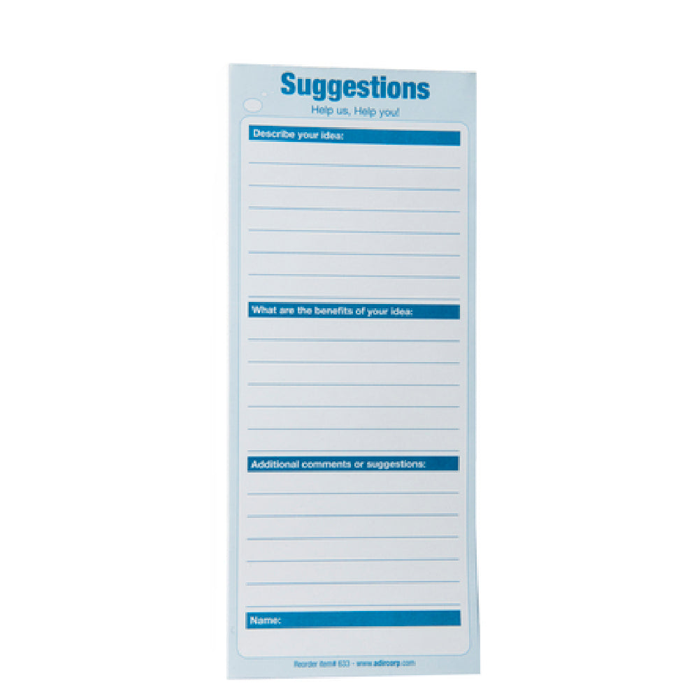 The Alpine Industries ADI633-50 Suggestion Box Cards (50 Pk) are designed to enhance feedback collection processes across various industries. This product consists of a pack of 50 cards, specifically tailored to fit within standard suggestion boxes. The ADI633-50 model ensures seamless integration into existing feedback systems, making it a versatile tool for organizations focused on improving customer and employee interactions. These suggestion box cards are crafted with precision to facilitate easy writing and submission, optimizing the user experience for individuals providing feedback. With their sleek design and professional appearance, the cards are suitable for a wide range of environments, from corporate offices to retail settings. The pack of 50 cards ensures that organizations are well-equipped to handle substantial volumes of feedback over time. Alpine Industries, known for its commitment to quality and innovation, has developed these cards to support businesses in gathering insightful suggestions and comments, ultimately aiding in the enhancement of services and operational efficiency. The ADI633-50 cards are an essential component for any organization aiming to foster open communication and continuous improvement.
