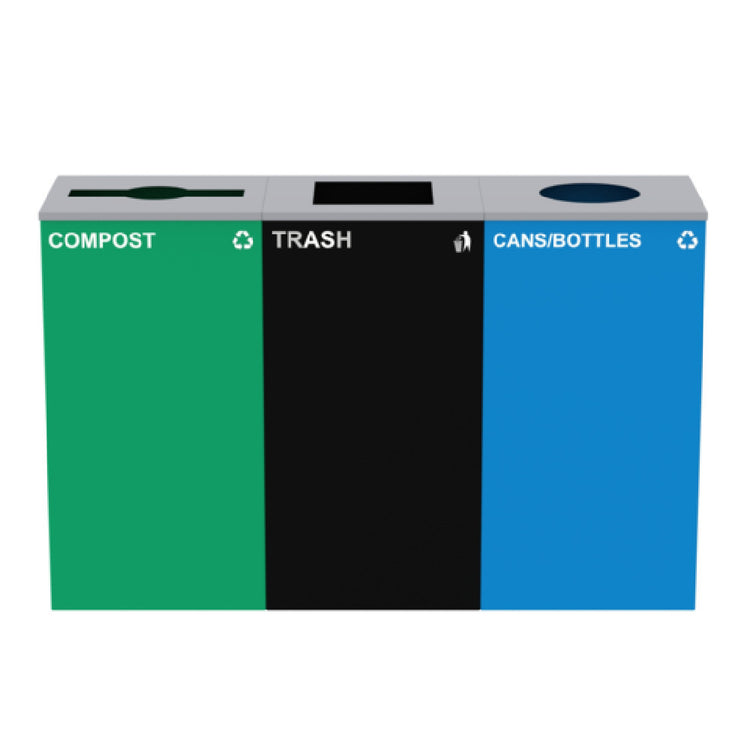 Alpine Industries ALP4450-BLK-KIT38 Cans & Bottles Bin With Compost And Trash Can Station is a versatile and practical solution for waste management across various industry sectors. This station is crafted from durable steel and is designed to accommodate a total capacity of 87 gallons, offering ample space for sorting waste efficiently. The unit features a three-stream system, strategically organized to segregate cans and bottles, compostables, and general trash, thereby promoting recycling and sustainable waste disposal practices. The color-coded bins in blue, green, and black provide clear visual guidance for users, ensuring easy and accurate waste sorting. This product is particularly valuable for businesses, educational institutions, and public facilities aiming to enhance their environmental stewardship. Its robust construction ensures longevity and reliability, making it an ideal choice for high-traffic areas. The Alpine Industries ALP4450-BLK-KIT38 is not only a functional addition to any setting but also a commitment to supporting eco-friendly initiatives. Its thoughtful design and organizational capabilities address the needs of diverse market segments seeking efficient waste management solutions.
