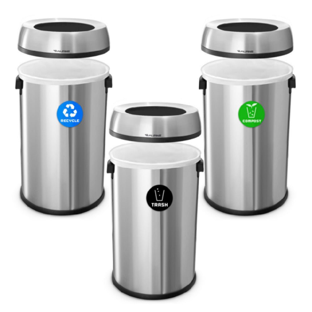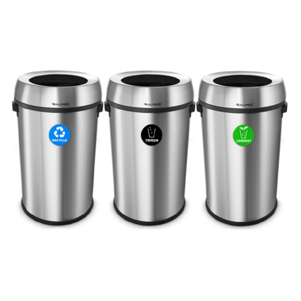 The Alpine Industries ALP470-65L-R-T-CO Recycling With Trash And Compost Station 17 Gallon (65 Liter) Each is an innovative solution designed to streamline waste management in a variety of settings, including offices, commercial spaces, and public areas. This station features three distinct streams, allowing for efficient separation of recyclables, trash, and compost materials, making it an ideal choice for environmentally-conscious organizations aiming to reduce waste. Each unit measures 16-1/2 inches in width, 15-70 inches in depth, and 27-1/10 inches in height, with a capacity of 17 gallons (65 liters) per stream, providing ample space for waste collection. Constructed from high-quality stainless steel, this station boasts a brushed finish that offers both durability and a modern aesthetic. The open top design ensures easy access for waste disposal and maintenance. Additionally, it is ADA compliant, highlighting its accessibility and user-friendly design for individuals with disabilities. The Alpine Industries ALP470-65L-R-T-CO is engineered to meet the diverse needs of various market segments, providing a practical and sustainable waste management solution that aligns with contemporary environmental standards.