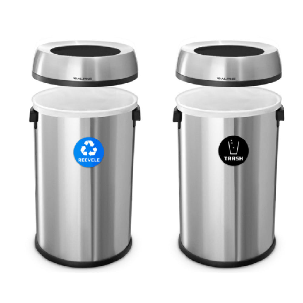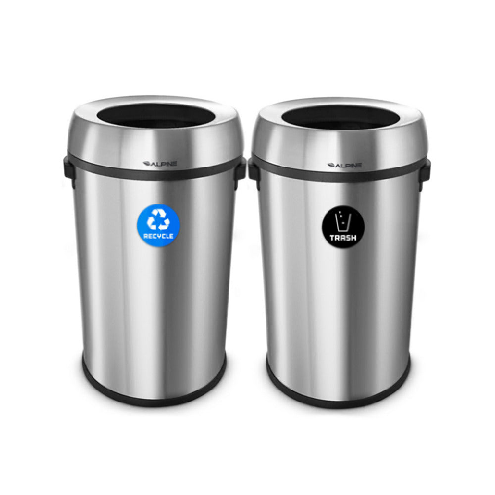 The Alpine Industries ALP470-65L-R-T Recycling Bin And Trash Receptacle 17 Gallon (65 Liter) Each is a meticulously designed waste management solution that seamlessly integrates sustainability and convenience. Each unit measures 16-1/2" x 15-70"D x 27-1/10"H, providing ample capacity while maintaining a compact footprint suitable for various environments. Featuring two streams with an open top design, these receptacles facilitate efficient sorting and disposal of waste and recyclables. Constructed from stainless steel with a brushed finish, the ALP470-65L-R-T is not only durable but also aesthetically pleasing, making it an ideal choice for both indoor and outdoor use. Its compliance with ADA standards ensures accessibility and ease of use for all individuals, enhancing its applicability for diverse market segments, including corporate offices, educational institutions, and public facilities. This recycling bin and trash receptacle is engineered to support environmental sustainability efforts and promote organized waste management practices, underscoring its value as a practical and environmentally conscious choice for businesses and organizations aiming to improve their ecological footprint.
