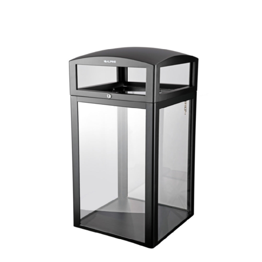 The Alpine Industries ALP471-40-CLR All Weather Trash Container is a versatile and durable solution for waste management across various environmental conditions. With a capacity of 40 gallons, this clear trash receptacle measures 21-1/4" x 21-1/4" x 41-1/3"H, making it suitable for high-traffic areas and large volumes of waste. Designed to withstand diverse weather conditions, it features a powder-coated steel construction that enhances its resilience and longevity. The trash container is DSH compliant, ensuring adherence to safety and design standards. It is equipped with a piano hinge for smooth lid operation and dual chain retainers for added security in lid positioning. The slotted bottom design facilitates effective drainage, while the interior metal clips provide structural integrity and support for the transparent panels. These clear panels not only allow for easy monitoring of waste levels but also contribute to a clean and contemporary aesthetic. This trash container is an ideal choice for outdoor public spaces, commercial settings, and other environments demanding robust waste management solutions.