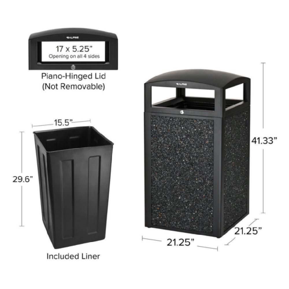 The Alpine Industries ALP471-40-GRYS All Weather Trash Container is a robust solution designed to meet the waste management needs across diverse environments. With a sizeable capacity of 40 gallons, it accommodates substantial refuse, catering effectively to high-traffic areas such as parks, schools, and commercial facilities. This trash container is engineered with a leak-proof plastic insert, ensuring efficient waste containment and easy maintenance. The exterior features a durable powder-coated steel frame and lid, providing exceptional resistance against weather elements, making it a reliable choice for outdoor use. For added security, the container is equipped with a lid that includes a lock and key mechanism, helping maintain cleanliness and prevent unauthorized access. Its rugged construction is complemented by adjustable legs, which allow the unit to remain stable on uneven surfaces, enhancing its versatility in various settings. The design is aesthetically completed with gray stone panels, blending functionality with a modern look. The Alpine Industries ALP471-40-GRYS is a high-performance trash container offering durability, security, and adaptability, making it an indispensable asset for public and private spaces seeking efficient and attractive waste management solutions.