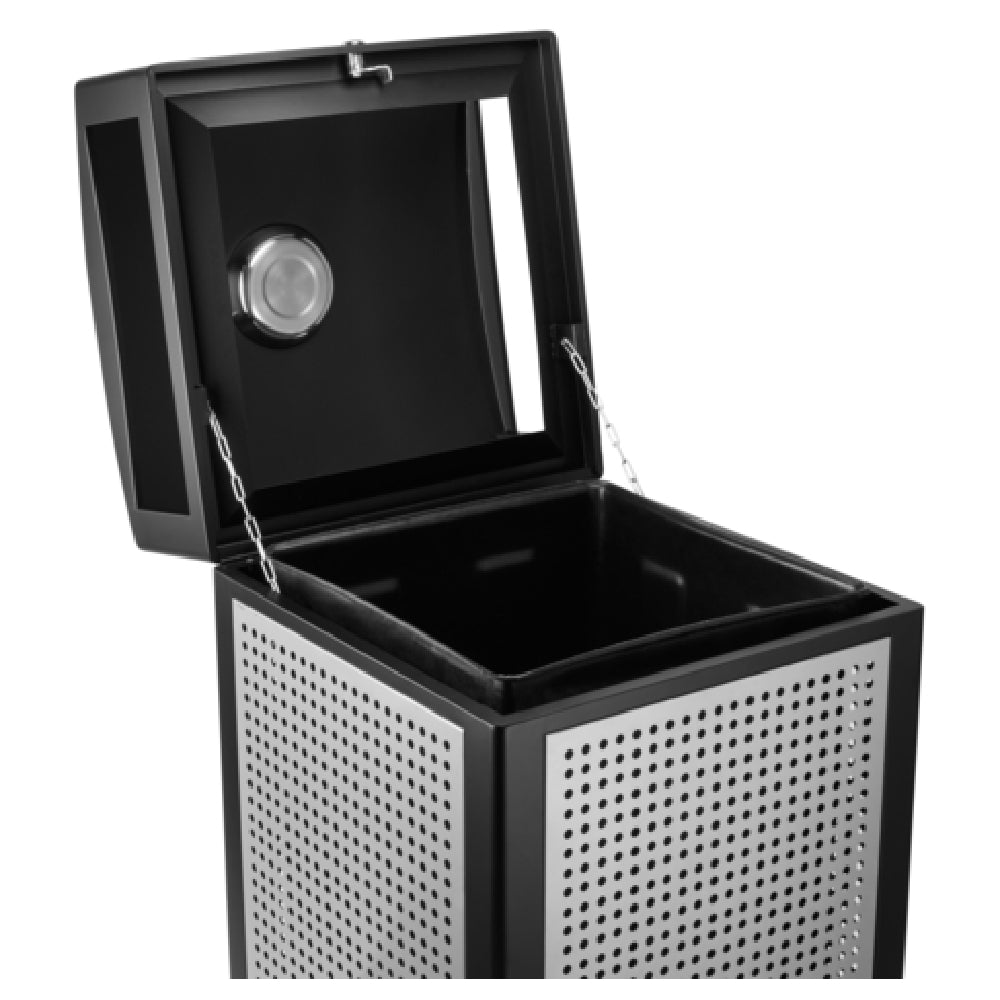 The Alpine Industries ALP472-40-SIL All Weather Trash Container is a versatile waste management solution with a substantial capacity of 40 gallons, specifically designed to withstand diverse environmental conditions. Measuring 21" x 21" x 41-1/3"H, this trash container is constructed with a rugged, weather-resistant powder-coated steel frame and lid, ensuring durability in both indoor and outdoor settings. It features a stainless steel ashtray for added convenience and a leak-proof plastic insert to prevent waste leakage, making it a practical choice for commercial spaces, parks, and public areas. The inclusion of adjustable legs allows for stable placement on uneven surfaces, ensuring a reliable stand in various environments. The container is further enhanced with perforated galvanized steel decorative panels, providing not only a sleek silver aesthetic but also improved ventilation. This design detail makes it a suitable option for those looking to maintain a clean and modern appearance while managing waste effectively. The Alpine Industries ALP472-40-SIL is tailored to meet the needs of multiple market segments, offering a combination of functionality, durability, and style, making it a valuable component for any facility requiring robust trash management solutions.