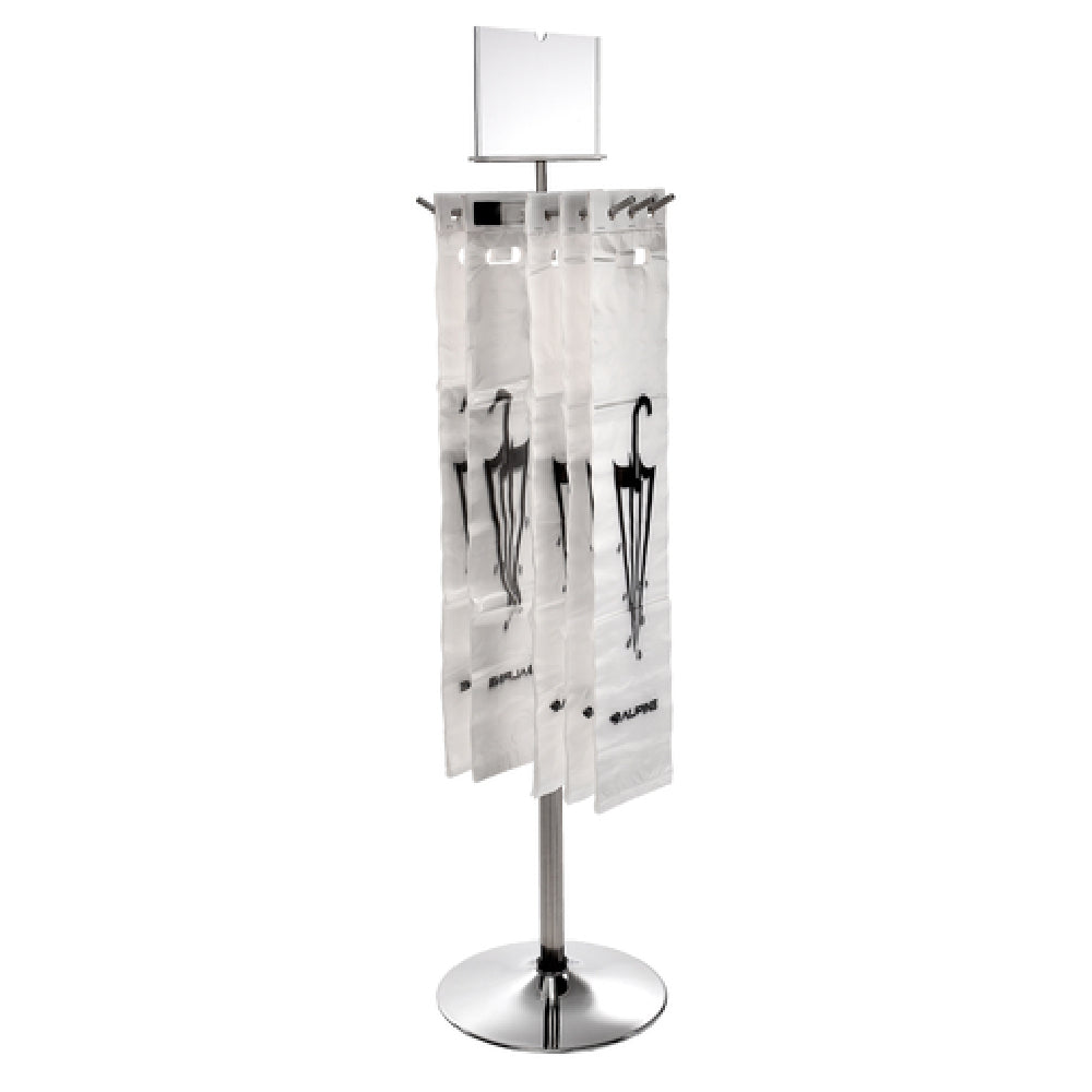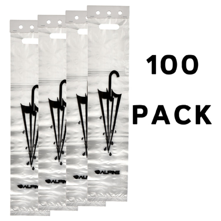 The Alpine Industries ALP489-100 Wet Umbrella Bags 100 Pack is a practical solution designed to address the common issue of wet umbrellas in public and commercial spaces. This product includes a hundred individual bags, each constructed from high-density polyethylene (HDPE), ensuring durability and reliability. The bags are presented in a classic white color, making them suitable for a variety of environments from corporate offices to retail spaces. Each wet umbrella bag is equipped with easy carry handles, enhancing convenience for users by allowing effortless transportation of wet umbrellas. This feature not only aids in maintaining cleanliness and safety by reducing water trails but also provides an added level of customer service in establishments prone to inclement weather. The ALP489-100 is an essential utility that caters to diverse segment markets within industries such as hospitality, retail, and corporate offices, all of which benefit from maintaining a tidy and hazard-free environment. By incorporating these bags into their facilities, businesses can significantly enhance visitor experience, ensuring both aesthetic appeal and functional utility. With its straightforward application and effective design, the Alpine Industries ALP489-100 Wet Umbrella Bags serve as a valuable asset for any professional setting seeking to manage rain-soaked items efficiently and discreetly.