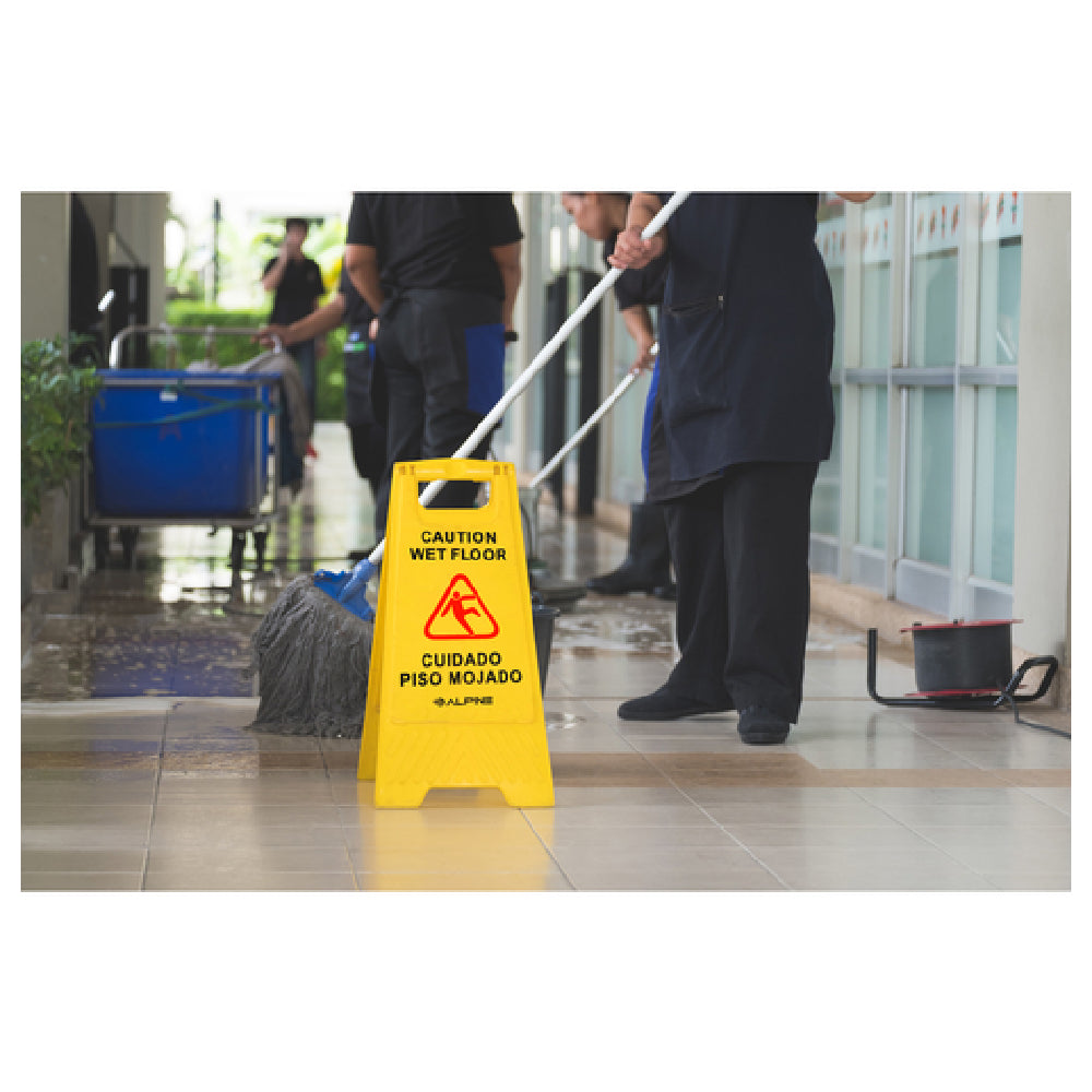 The Alpine Industries ALP499-3 Alpine Industries Caution Wet Floor Sign 24" H A-frame serves as a crucial safety tool in various environments requiring precautionary signage. Standing at a height of 24 inches, this A-frame sign is prominently designed to alert passersby to hazardous wet floor conditions effectively. Its vibrant yellow color enhances visibility, ensuring that the warning is easily noticed, an essential feature in high-traffic areas such as commercial buildings, restaurants, and hospitals. The product comes in a convenient pack of three, offering flexibility and value for businesses needing multiple units for widespread coverage. The A-frame design provides stability and ease of storage, making it practical for both permanent and temporary use. Constructed for durability, this caution wet floor sign is ideal for janitorial staff and facility managers responsible for maintaining safe environments. By combining practical design with reliable functionality, the Alpine Industries ALP499-3 sign is a valuable addition to any safety protocol, addressing the needs of various market segments such as industrial facilities, retail spaces, and educational institutions. Its straightforward yet effective design underscores its purpose as a dependable safety measure, reinforcing its role in accident prevention and ensuring a safer environment for all.