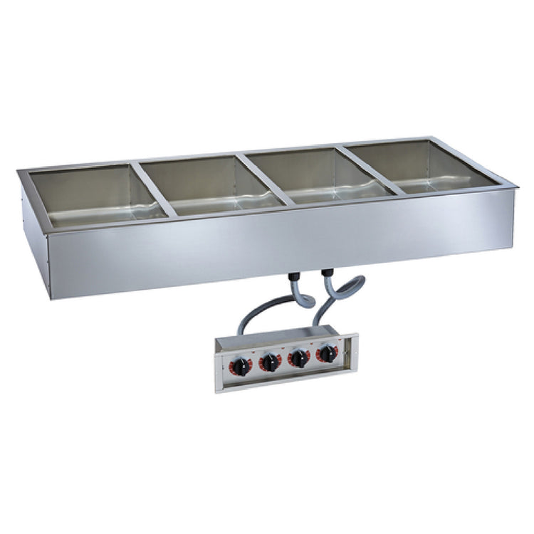 The Alto Shaam 400-HWILF/D4_230/60/1 Halo Heat® Hot Food Well Unit with Large Flange is a versatile drop-in electric unit designed to accommodate the demanding needs of various food service environments. With a capacity to hold four 12" x 20" full-size pans (pans not included), this unit offers a spacious 4-3/8" deep well suitable for 4" deep pans, providing ample room for hot food presentation and storage. Its stainless steel construction ensures durability and longevity, essential for high-volume operations. Featuring four adjustable thermostatic controllers, it allows precise temperature management, ideal for maintaining the quality and safety of hot food. The EcoSmart® technology incorporated into its design highlights an emphasis on energy efficiency, aligning with modern sustainability standards. The unit is certified by multiple agencies, including cULus, UL EPH Classified, CE, IPX3, and TUV NORD, underscoring its compliance with rigorous safety and performance standards. The Alto Shaam 400-HWILF/D4_230/60/1 is uniquely suited for catering businesses, restaurants, and other commercial food service applications, providing a reliable and efficient solution for keeping food warm and ready to serve. Its large flange design facilitates easy integration into existing setups, making it a practical choice for any professional kitchen.
