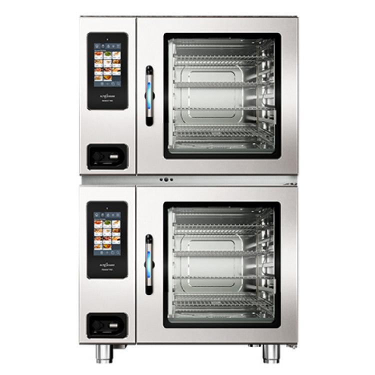 Alto-Shaam, 7-20G PRO OVER 7-20G PRO-QS, (Quick Ship - STK806137) Prodigi™ Pro Combi Oven/Steamer, gas, boiler-free, double stack, (7) 18" x 26" full size sheet or (16) 12" x 20" full size hotel pan (GN 1/1) capacity per oven, Wi-Fi enabled control with steam/convection/combi cooking modes, programmable cool-down, SafeVent™ steam venting, removable "T" style temperature probe, (3) power levels, (5) cleaning levels, triple-pane doors, (2) side racks with (8) non-tilt support rails per oven, (4) shelves, high efficiency LED lighting, doors hinged right, stainless steel construction, adjustable stainless steel legs, (2) 98,000 BTU, EcoSmart®, cULus, UL EPH Classified, CE, IPX5, EAC, ENERGY STAR®