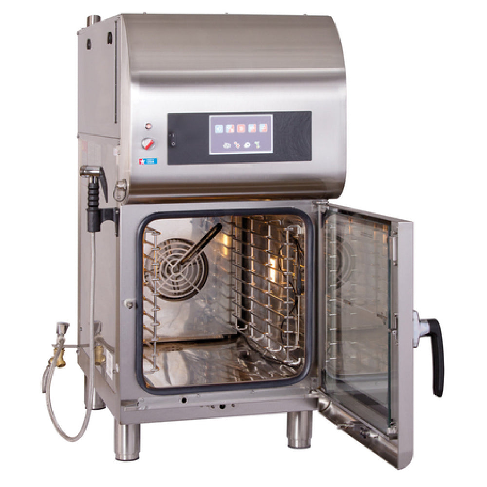 The Alto Shaam CTX4-10EVH_220-240/60/1 Combitherm® CombiOven Electric Countertop is an advanced cooking appliance designed for professional culinary environments, featuring cutting-edge technology. Its compact countertop design incorporates a ventless hood, making it a versatile solution for small kitchens. The oven accommodates either five full-size hotel pans measuring 12" x 20" or ten half-size sheet pans at 18" x 13", providing substantial cooking capacity. Equipped with ExpressTouch control, it offers a two-speed reversing fan, retherm mode, moisture injection, and six browning levels for precise cooking results. Energy efficiency is enhanced with reduced energy levels and steam venting. Additional features include a delayed start time, shelf timer, and USB port for easy program updates. The CombiClean® system with a hand sprayer kit ensures effortless maintenance. Constructed from durable stainless steel, it includes adjustable bullet legs for stability. The EcoSmart® design aligns with energy conservation goals. Certified by cULus, UL EPH ANSI/NSF 4, CE, EAC, and IPX4, it adheres to rigorous safety standards and holds a city-wide Certificate of Approval (COA) for New York City. The Alto Shaam CTX4-10EVH is ideal for diverse segment markets, from high-volume restaurants to compact urban kitchens.