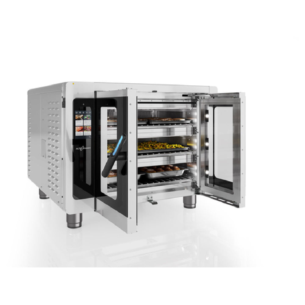 The Alto Shaam VMC-F3E Vector® F Series Multi-Cook Oven Electric is a versatile kitchen appliance renowned for its three individually controlled cooking chambers, allowing for simultaneous preparation of different dishes. Each chamber can accommodate either six half-size sheet pans or three full-sized sheet pans, providing ample cooking capacity for busy commercial kitchens. The oven features programmable touch screen controls enhanced with Structured Air Technology®, ensuring precise and consistent cooking results. The double pane glass door and interior LED cavity lighting offer improved visibility and efficiency during operation. Constructed with durable stainless steel, the oven is designed for longevity and ease of maintenance. Additional components include one wire rack and two jet plates for each cooking chamber, facilitating varied cooking applications. The integration of a USB port allows for easy updates and menu customization. Standing on 4-inch adjustable legs, the oven is designed to meet cULus and UL EPH Classified standards, ensuring safety and reliability. Proudly made in the USA, the Alto Shaam VMC-F3E Vector® F Series is an ideal choice for restaurants, catering services, and other food service operations that require a high-capacity, multifunctional oven with advanced cooking technology.