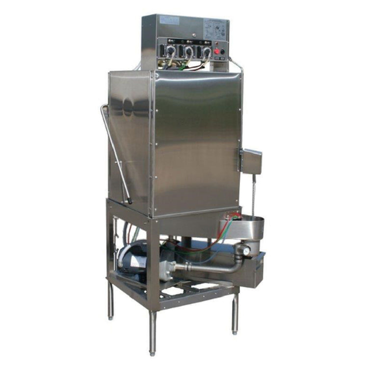 The American Dish Service AFB-C Bakery Dishmachine is a door-type unit designed for low temperature chemical sanitizing, making it an optimal choice for bakeries prioritizing efficiency and cleanliness. This machine can handle up to 37 racks per hour, emphasizing its capability in high-demand environments. It features a 27-1/2 inch door opening, allowing for seamless loading and unloading processes. Powered by a robust 1-1/2 HP pump, the AFB-C ensures effective washing performance. This model is equipped with an auto-start function, enhancing operational convenience, and reducing manual intervention. The front mount controls provide easy access and usability, streamlining the dishwashing process. Additionally, the built-in chemical dispensing system ensures precise sanitization, maintaining high hygiene standards. The dishmachine's corner design is space-efficient, ideal for facilities with limited floor space. Its free-standing single scrap accumulator aids in maintaining a clean workspace by efficiently collecting food debris. The American Dish Service AFB-C Bakery Dishmachine is engineered to meet the rigorous demands of commercial kitchens, offering reliability and superior cleaning performance tailored for the bakery industry. Its combination of technical prowess and practical design makes it an indispensable addition to any professional bakery setting.