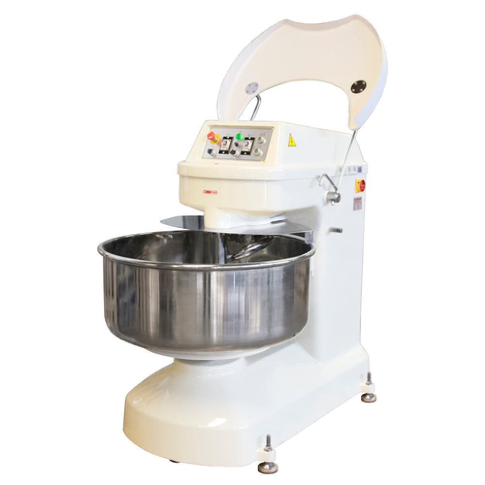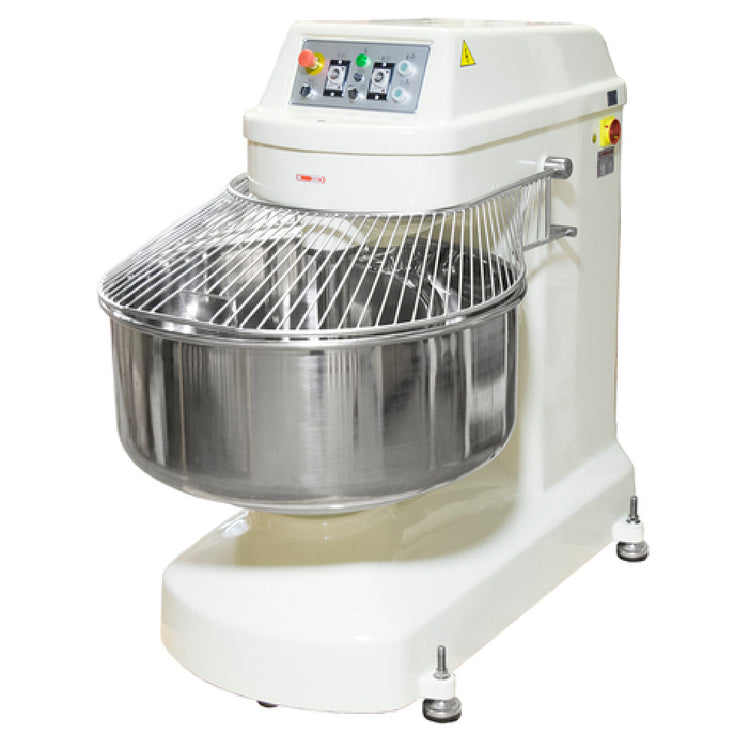 American Eagle Food Machinery, AE-100K, Spiral Mixer, 220 quart fixed bowl, 330 lbs. dough capacity, 2-speed, belt driven, dual 30-minute timer, reverse feature, safety guard with auto-shutoff, thermal overload protection, cast iron construction with enamel coating, 15 HP agitator motor/7.5 HP bowl motor, 220v/60/3-ph, 40.0/30.0 amps, CE, cETLus, ETL-Sanitation (SPECIAL ORDER)