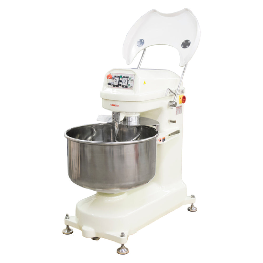 American Eagle Food Machinery, AE-5080, Spiral Mixer, 125 quart fixed bowl, 176 lbs. dough capacity, 2-speed, belt driven, dual 30-minute timer, reverse feature, safety guard with auto-shutoff, thermal overload protection, cast iron construction with enamel coating, 5 HP agitator motor/2 HP bowl motor, 220v/60/3-ph, 24.2/16.3 amps, CE, cETLus, ETL-Sanitation