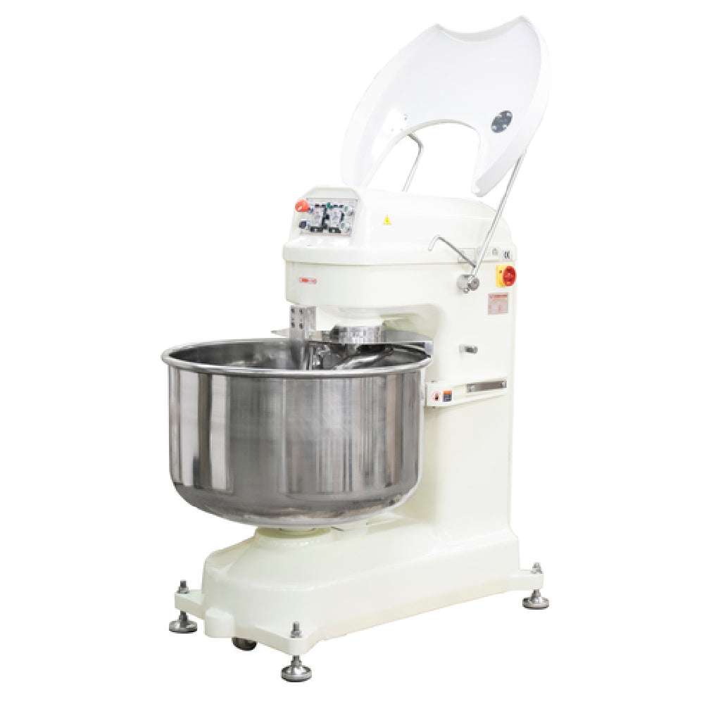 American Eagle Food Machinery, AE-75K, Spiral Mixer, 190 quart fixed bowl, 264 lbs. dough capacity, 2-speed, belt driven, dual 30-minute timer, reverse feature, safety guard with auto-shutoff, thermal overload protection, cast iron construction with enamel coating, 11.5 HP agitator motor/5.0 HP bowl motor, 220v/60/3-ph, 31.5/24.0 amps, CE, cETLus, ETL-Sanitation