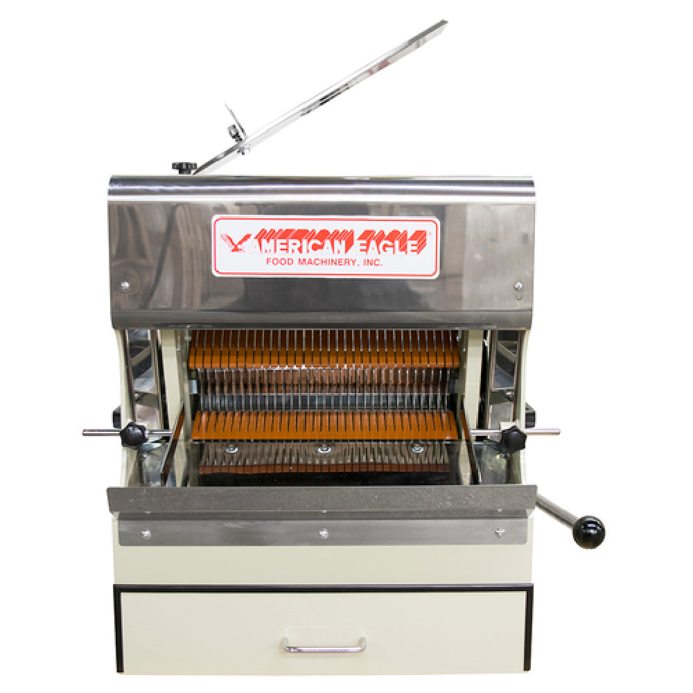 American Eagle Food Machinery, AE-BS01-1/2, Bread Slicer, countertop, automatic, 1/2" thick slices, 15" maximum loaf size, slices (7.5) loaves/min., belt drive, safety guard, push lever feed, thermal overload protection, bread crumb drawer, stainless steel food contact surfaces, heavy duty steel frame, 1/2 HP, 115v/60/1-ph, 7.0 amps, CE (SPECIAL ORDER)