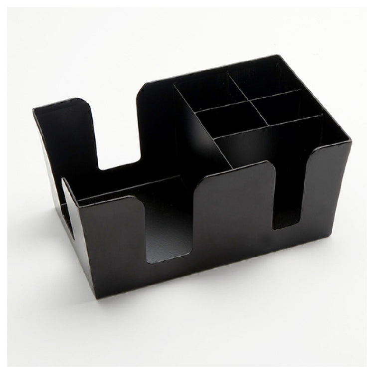 The American Metalcraft BARB7 Bar Caddy is a meticulously designed organizer tailored for efficient bar management, measuring 9 inches in length, 6 inches in width, and 4 inches in height. It features a practical 6-compartment layout, providing ample space for organizing cocktail napkins, straws, stirrers, and other essential bar accessories, ensuring that everything is readily accessible during busy service times. The bar caddy's powdered-coated black finish not only enhances its aesthetic appeal but also adds a layer of durability, making it a resilient choice for high-traffic environments. Constructed to withstand the rigors of daily use, the BARB7 is an ideal solution for bars, restaurants, and catering events, where organization and efficiency are paramount. Its sleek design seamlessly complements a variety of decors, from modern to traditional, and it fits effortlessly into the workflow of any beverage service operation. The American Metalcraft BARB7 Bar Caddy stands out for its functional design and robust build, offering a versatile option for professionals looking to streamline their operations while maintaining a tidy and organized workspace. This product is a testament to American Metalcraft's commitment to quality and practicality in the hospitality industry.