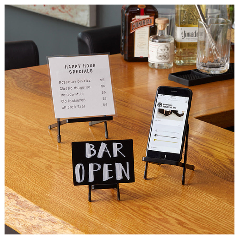 The American Metalcraft BDS2 Display Stand is a versatile and compact solution, measuring 2"L x 3.4"W x 3.25"H, perfect for a variety of display needs across different market segments. Crafted from metal and finished in black, it not only provides robust support but also adds a sleek, professional touch to any presentation. Its size and design make it an ideal option for showcasing smaller items in retail environments, enhancing product visibility without occupying excessive space. Restaurants and cafes can utilize the stand to elegantly present menu cards or promotional material, while its sturdy construction ensures stability and durability in high-traffic areas. The American Metalcraft BDS2 Display Stand is also suited for use in exhibitions and trade shows, where its understated design allows the focus to remain on the displayed products or information. Its metal construction offers longevity, making it a reliable choice for businesses seeking lasting value. This display stand's dimensions and materials are carefully selected to balance form and function, resulting in a product that meets the practical needs of various industries while maintaining an aesthetically pleasing appearance. With its black finish, the stand seamlessly integrates into diverse settings, enhancing the presentation of items with understated elegance.