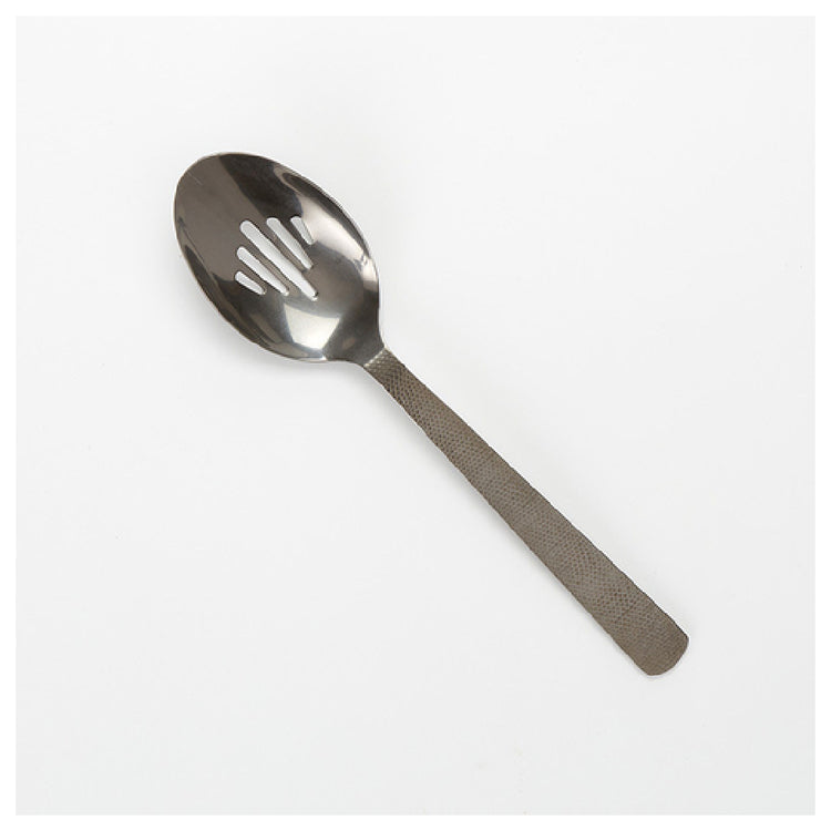 The American Metalcraft BLHSS10 Serving Spoon 10"L Slotted is a versatile kitchen tool expertly crafted to meet the needs of both professional chefs and home cooking enthusiasts. Measuring 10 inches in length, this slotted serving spoon is designed for efficient draining and serving of various food items, making it an indispensable addition to any culinary setting. Constructed from 18/0 stainless steel, it ensures durability and resistance to corrosion, maintaining its quality through repeated use. The vintage black finish not only adds a touch of elegance but also complements a wide range of kitchen decors and dining settings. Its hammered texture provides a unique aesthetic appeal, enhancing grip and handling comfort during use. The American Metalcraft BLHSS10's combination of form and function makes it an ideal choice for catering businesses, restaurants, and home kitchens alike, where style and practicality are equally valued. Whether it's used for serving salads, pasta, or vegetables, this slotted serving spoon stands out for its robust build and visually striking design, offering a blend of traditional craftsmanship and modern utility tailored to diverse culinary environments.