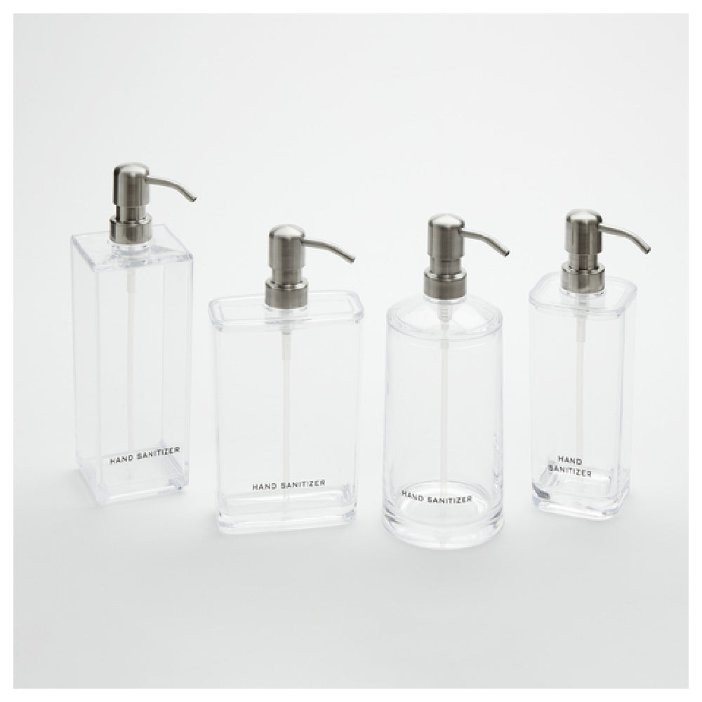 The American Metalcraft DPS17 Sanitizer Dispenser is a meticulously designed pump-style dispenser with a capacity of 17 oz., ideal for various professional environments seeking both functionality and elegance. Its dimensions are precisely 2-7/8 inches long, 2-7/8 inches wide, and 8 inches high, ensuring it fits seamlessly into any setting without occupying excessive space. The dispenser's square shape complements its modern aesthetic, while the clear polystyrene base allows easy monitoring of sanitizer levels, ensuring timely refills. The brushed stainless steel pump not only provides durability but also adds a touch of sophistication, making it suitable for upscale venues. A silkscreen label on the dispenser clearly states "HAND SANITIZER," aiding in effective communication and use in high-traffic areas. While the sanitizer itself is sold separately, the dispenser’s design is optimized for easy integration into existing sanitation protocols across industries such as hospitality, healthcare, and corporate offices. By combining practical features with a sleek design, the American Metalcraft DPS17 Sanitizer Dispenser stands out as a versatile and reliable choice for maintaining hygiene standards in various professional settings.