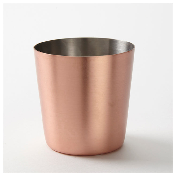 The American Metalcraft FFCCS337 French Fry Cup is a meticulously crafted 14 oz. container, designed for both aesthetic appeal and functional use in the food service industry. With precise dimensions of 3-3/8" in diameter and 3-3/8" in height, this round, straight-sided cup is an ideal choice for serving French fries, appetizers, and other finger foods. Its copper construction provides a striking visual impact, enhanced by a satin finish that exudes sophistication and style. The copper material, while visually appealing, requires hand washing only, ensuring the product maintains its quality and finish over time. This French fry cup caters to a variety of market segments, including upscale restaurants, trendy cafes, and catering services looking to add a touch of elegance to their presentation. The American Metalcraft FFCCS337 not only enhances food presentation but also complements table settings with its unique, modern design, making it a versatile and valuable addition to any dining establishment. Its practical size and durable build make it a reliable choice for professionals in the food industry, looking for both functionality and style in their serving ware.