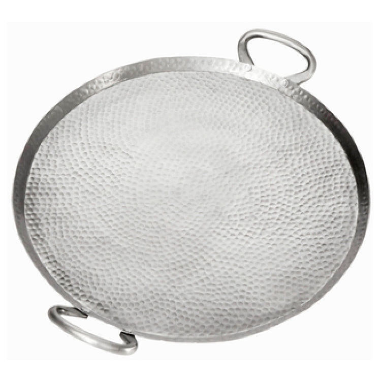 The American Metalcraft G17 Griddle is a versatile culinary tool, measuring 20-1/2 inches in length (with handle) by 17 inches in width and 2 inches in height. This round griddle is crafted from high-quality stainless steel, ensuring durability and longevity in various cooking environments. Its hammered finish not only adds an aesthetically pleasing touch but also enhances its heat retention properties, making it ideal for professional kitchens and home chefs alike. The American Metalcraft G17 Griddle is particularly suitable for restaurants, catering services, and culinary enthusiasts who demand precision and reliability in their cookware. Its generous dimensions provide ample space for cooking multiple items simultaneously, catering to the needs of busy kitchens and providing efficiency in food preparation. The griddle's robust construction ensures it withstands the rigors of frequent use, while its sleek design complements modern kitchen aesthetics. This product exemplifies the blend of practicality and style, making it a valuable addition to any commercial or domestic kitchen setting where quality and functionality are paramount.