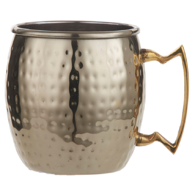 The American Metalcraft GM16H Moscow Mule Mug is a 16 oz. vessel, designed with a distinctive gold hammered finish that catches the eye. This mug measures 3-1/4 inches in diameter and stands at a height of 3-7/8 inches, offering a comfortable volume and size for a variety of cold beverages. Crafted from durable stainless steel, it ensures longevity and reliability for repeated use. The addition of a brass handle not only enhances its aesthetic appeal but also provides a sturdy grip, ensuring ease of handling during use. Ideal for bars, restaurants, and home use, this mug's unique design makes it a standout choice for serving the classic Moscow Mule cocktail or any chilled drink of choice. Due to its intricate finish, it is recommended for hand wash only to preserve its metallic sheen and quality. The American Metalcraft GM16H Moscow Mule Mug represents a fusion of functionality and style, making it a versatile addition to any beverage service setting where both performance and presentation are key.