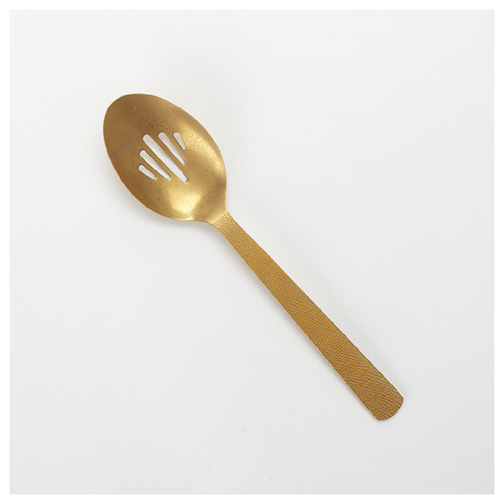The American Metalcraft GVHSS10 Serving Spoon 10"L Slotted is a sophisticated and functional utensil designed for culinary professionals and enthusiasts alike. Measuring 10 inches in length, this serving spoon is crafted from durable 18/0 stainless steel, known for its resistance to corrosion and ease of maintenance, ensuring longevity and reliability in demanding kitchen environments. The slotted design of the spoon is a practical feature, allowing for efficient draining of liquids while serving, making it an ideal choice for various food service settings. This serving spoon stands out with its unique hammered texture, offering an elegant aesthetic that complements its functionality. Its vintage gold finish adds a touch of sophistication and style, making it a perfect fit for upscale dining establishments or events seeking both elegance and utility. The American Metalcraft GVHSS10 is a versatile tool suitable for a range of market segments, from high-end restaurants to catering services, due to its combination of style, durability, and practicality. This serving spoon embodies a blend of classic design and modern needs, making it a valuable addition to any dining service aiming to impress with both appearance and performance.