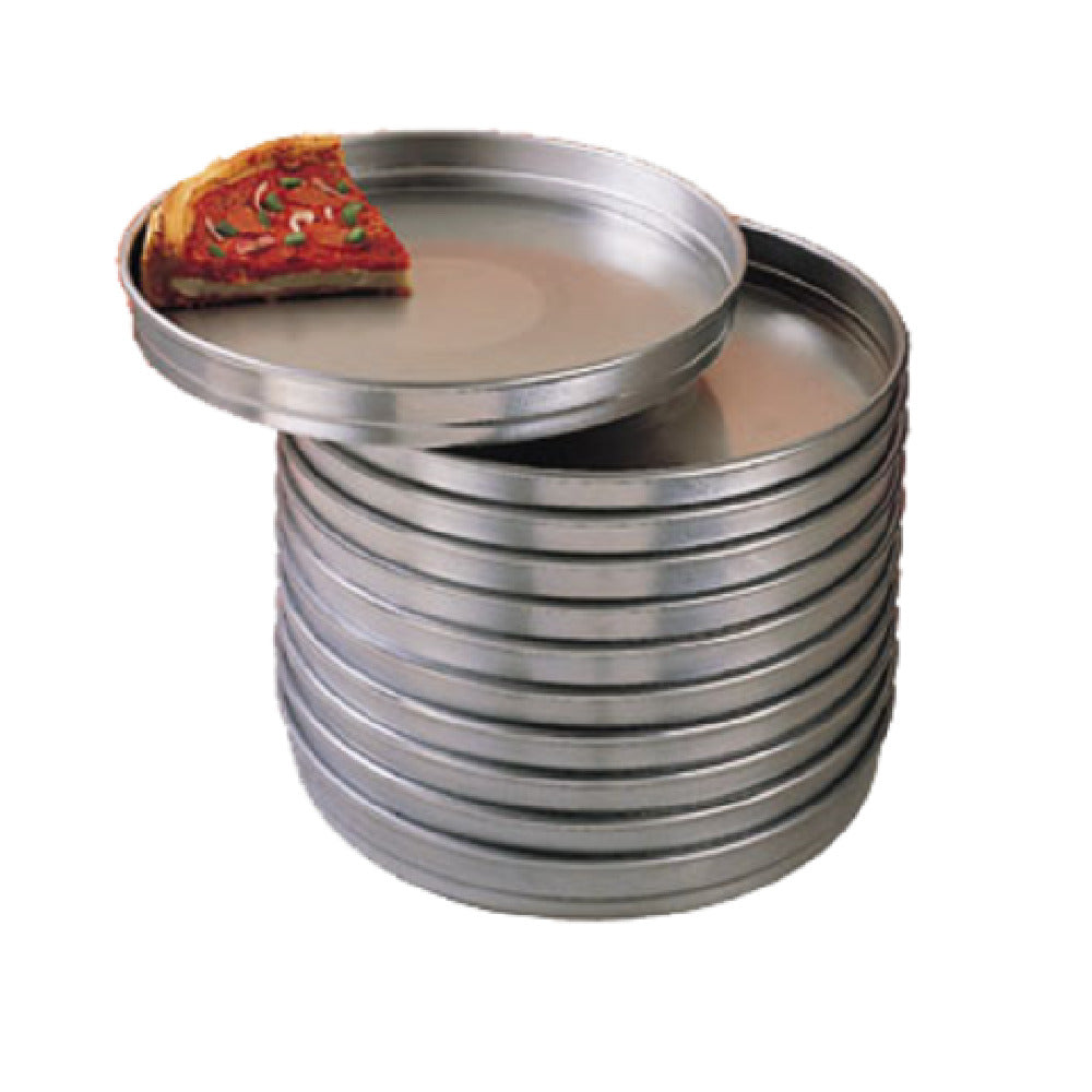 The American Metalcraft HA5115 Pizza Pan Straight-sided Self-stacking is a meticulously crafted kitchen essential, engineered for both professional and home use. This pan features a substantial 15-inch top inside diameter and a slightly narrower 14-7/8-inch bottom inside diameter, with a 1-1/2-inch depth, making it ideal for creating perfectly shaped pizzas with a consistent thickness. Constructed from durable 14 gauge aluminum, it ensures excellent heat distribution for evenly cooked crusts. The pan's self-stacking design is particularly advantageous for kitchens with limited storage space, allowing multiple pans to be neatly stacked without risking surface damage. Proudly made in the USA, this pizza pan upholds high manufacturing standards. However, it requires hand washing, ensuring longevity and maintaining its quality finish. The American Metalcraft HA5115 is suited for a variety of market segments within the culinary industry, from bustling pizzerias that demand durability and efficient storage solutions to dedicated home chefs who appreciate professional-grade cookware. Its solid construction and practical design not only offer unparalleled utility but also reflect a commitment to quality and performance in pizza preparation. By integrating robust material with a user-friendly design, this pizza pan is a valuable asset in any kitchen setting.