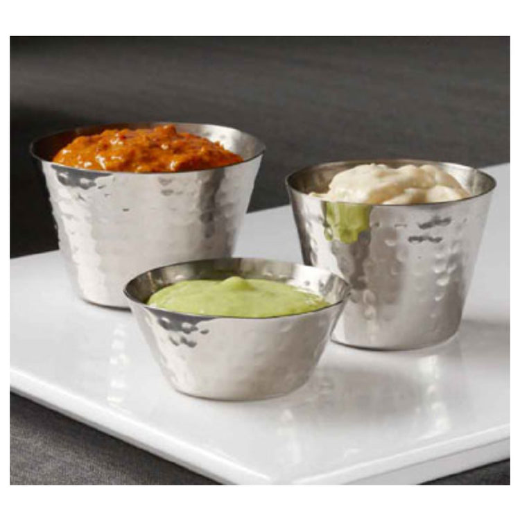The American Metalcraft HAMSC3 Sauce Cup is a meticulously crafted piece designed to meet the diverse needs of the food service industry. With a capacity of 1-1/2 oz., this sauce cup is ideal for serving sauces, dressings, or condiments in controlled portions, making it perfect for restaurants, caterers, and hospitality services that prioritize precision and presentation. Measuring 2-1/4 inches in diameter and 1 inch in height, it offers a compact yet sufficient size that fits comfortably on any table setting or tray, ensuring space efficiency in busy dining environments. The sauce cup is constructed from high-quality stainless steel, renowned for its durability and resistance to corrosion, which ensures long-lasting performance even under frequent use. A distinctive feature of this cup is its hammered dimples, which not only enhance its aesthetic appeal but also add a textured surface that can complement a variety of dining decors, from rustic to modern. The design and materials used in the American Metalcraft HAMSC3 Sauce Cup highlight its functionality and visual appeal, making it a versatile addition to any food presentation. Whether used in upscale dining establishments or casual eateries, this sauce cup delivers both style and utility in serving applications.