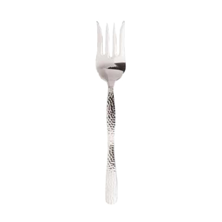 The American Metalcraft HM11CMF Buffet Ware Cold Meat Fork is a meticulously crafted utensil designed for both functionality and aesthetic appeal. Measuring 11 inches in length, this fork is ideal for serving cold meats at buffets or catering events. The standout feature of this utensil is its hammered handle, which not only provides an elegant and distinctive look but also enhances grip, ensuring ease of use in busy service environments. Constructed from high-quality stainless steel, the fork offers durability and resistance to corrosion, making it a reliable choice for long-term use in professional settings such as hotels, restaurants, and catering companies. Stainless steel is known for its sanitary properties, ensuring that the fork remains easy to clean and maintain, which is crucial in food service operations where hygiene is paramount. This product serves a variety of market segments within the hospitality industry, from upscale dining establishments seeking sophisticated serving solutions to catering operations that require practical yet stylish serving utensils. The American Metalcraft HM11CMF Cold Meat Fork is more than just a tool; it is a testament to the blend of form and function, catering to the needs of professionals who value both quality and presentation in their service ware.