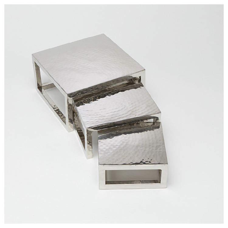 The American Metalcraft HMPRS3 Riser Set 3-piece is a versatile and stylish addition to any display setup, combining both aesthetic appeal and practical functionality. This set includes three distinct risers, each crafted with precision from durable stainless steel and featuring an elegant hammered finish. The risers are designed in a square shape, with dimensions measuring 8-3/4" square x 5" high, 7-3/4" square x 4" high, and 6-3/4" square x 3" high. These varying sizes allow for dynamic and tiered presentation arrangements, making them ideal for catering events, buffet setups, or retail displays. The high-quality stainless steel construction ensures long-lasting durability and resistance to corrosion, while the hammered finish adds a touch of sophistication and texture to the presentation. The American Metalcraft HMPRS3 Riser Set is perfect for professionals in the hospitality industry looking to enhance the visual appeal of their presentations, as well as for retail environments where showcasing products with style and elevation is crucial. The combination of its sturdy build, varying sizes, and attractive design makes this riser set a unique value proposition for businesses seeking to elevate their display aesthetics while maintaining functional versatility.