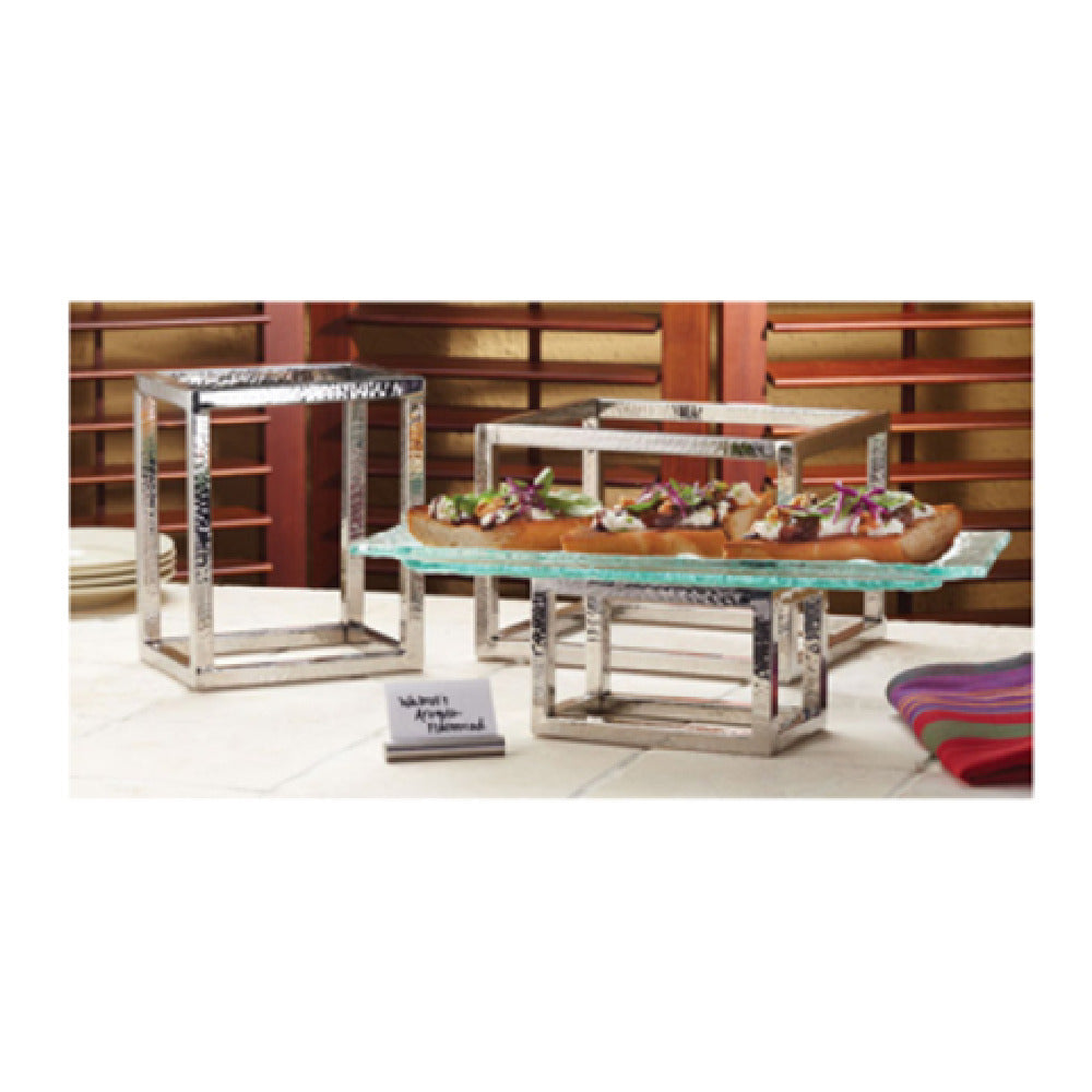 The American Metalcraft HMRRSET Frame Riser Set is a trio of risers made from durable stainless steel, each featuring a distinctive hammered finish. This elegant set includes three risers of varying dimensions: 7-1/2 inches in length, 4-5/8 inches in width, and 4-3/4 inches in height; 9-1/4 inches in length, 6 inches in width, and 6-1/2 inches in height; and 11-1/2 inches in length, 7-7/8 inches in width, and 7-1/2 inches in height. The diverse sizes provide flexibility and versatility, making them suitable for different display needs across various industry segments. The stainless steel construction not only offers a sleek, modern aesthetic but also ensures longevity and resistance to wear, making the set a reliable choice for both casual and formal settings. The hammered finish adds a touch of sophistication, enhancing the visual appeal of any presentation. Ideal for catering businesses, restaurants, or retail displays, these risers enable dynamic and eye-catching arrangements, helping to highlight products or dishes effectively. The American Metalcraft HMRRSET Frame Riser Set is an excellent addition for those looking to combine functionality with stylish presentation solutions.