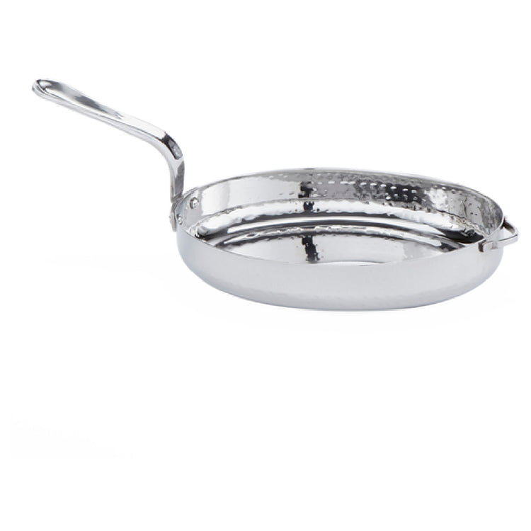 The American Metalcraft MPS22 Mini Skillet is a versatile piece of cookware designed for both professional and home chefs seeking quality and functionality. This mini skillet boasts a capacity of 22 oz., making it ideal for individual servings or side dishes. Measuring at 8 inches in length, 6-1/4 inches in width, and 1-3/8 inches in height, its compact, oval shape allows for easy handling and efficient use of space on the stove or in the oven. The skillet features a 4-inch long handle, providing a comfortable grip for easy maneuvering. Constructed from durable stainless steel, the skillet ensures longevity and resistance to rust and corrosion. Its hammered finish not only adds an aesthetic appeal but also enhances the skillet's heat retention and even heat distribution properties, making it suitable for a variety of cooking applications. This mini skillet is perfect for establishments in the food service industry, such as restaurants and catering services, looking to elevate their presentation with a touch of elegance. Additionally, its size and style make it suitable for home cooks who appreciate high-quality cookware with a professional touch. The American Metalcraft MPS22 Mini Skillet is a reliable choice for those in need of durable and stylish kitchenware.