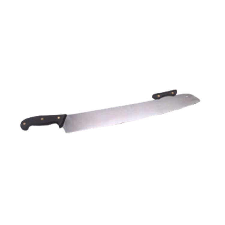 The American Metalcraft PPK17 Pizza Knife is an expertly crafted kitchen tool designed for precision and efficiency in food preparation. Featuring an impressive 18-inch stainless steel blade, this pizza knife is engineered for durability and longevity, making it an essential piece for busy pizzerias and professional kitchens. The blade's stainless steel composition ensures resistance to rust and corrosion, maintaining its sharpness and hygiene over time. Complementing the substantial blade is the POM double handle, which provides a comfortable yet secure grip, enhancing user control and safety during use. The dual-handle design allows for effortless maneuverability and balance, ideal for cutting through large pizzas with ease. This knife is specifically tailored for those in the culinary industry who require a reliable tool for consistent performance. Its robust construction and ergonomic features make it suitable for various market segments, from small artisanal pizza joints to large-scale commercial kitchens. The American Metalcraft PPK17 Pizza Knife stands out as a versatile and dependable option for professionals seeking precision and quality in their kitchen equipment.