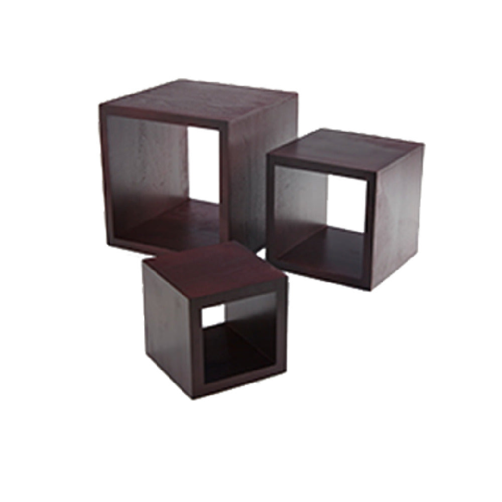 The American Metalcraft RSM2 Riser Set - Set Of 3 Various Sizes is a versatile display solution that caters to diverse presentation needs across multiple industry segments. This set includes three risers, with varying dimensions, including one at 5 inches square by 5 inches high, another at 7 inches square by 7 inches high, and the largest at 9 inches square by 9 inches high. Each riser is crafted from high-quality mahogany wood, offering a sophisticated and elegant appearance that enhances the visual appeal of any display setup. These risers are perfect for creating dynamic, multi-level presentations, making them ideal for restaurants, catering events, and retail displays. The use of wood ensures durability and a classic aesthetic, fitting seamlessly into both traditional and contemporary settings. The American Metalcraft RSM2 Riser Set provides a flexible and stylish solution for showcasing products, food items, or decorative pieces, allowing businesses to elevate their presentation standards and attract customer attention effectively.