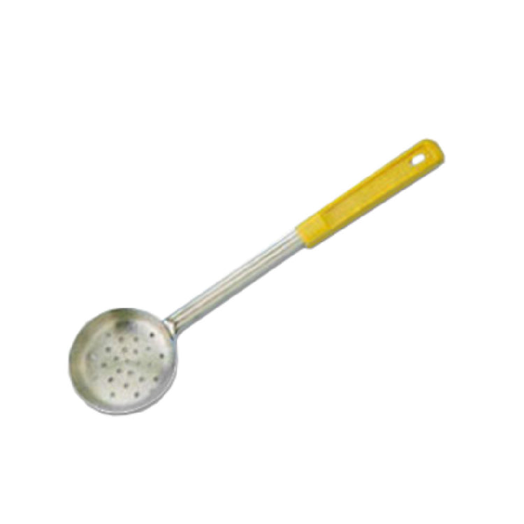 The American Metalcraft SPNP5 Spooner 5 Oz. 3-1/2" Diameter Perforated Stainless Steel Bowl is a high-quality, ladle-style utensil tailored to meet the precise needs of culinary professionals. With a capacity of 5 ounces and a diameter of 3-1/2 inches, this bowl is perfectly suited for a variety of kitchen tasks, including straining, serving, and portioning. Its perforated design allows for efficient drainage, making it ideal for use in commercial kitchens and catering environments where precision and efficiency are paramount. The durable stainless steel construction ensures longevity and resistance to corrosion, maintaining its functionality and aesthetic appeal over time. Equipped with a 10-3/4 inch Bakelite grip handle, this utensil provides comfort and control during use, reducing the risk of hand fatigue during extended periods of preparation. The handle's yellow color not only adds a touch of vibrant contrast but also aids in quick identification in busy kitchen settings. The one-piece design of this bowl enhances its durability and reduces the risk of breakage, making it a reliable choice for various market segments, including professional chefs, food service operators, and hospitality businesses seeking to enhance their kitchen efficiency and utensil longevity.