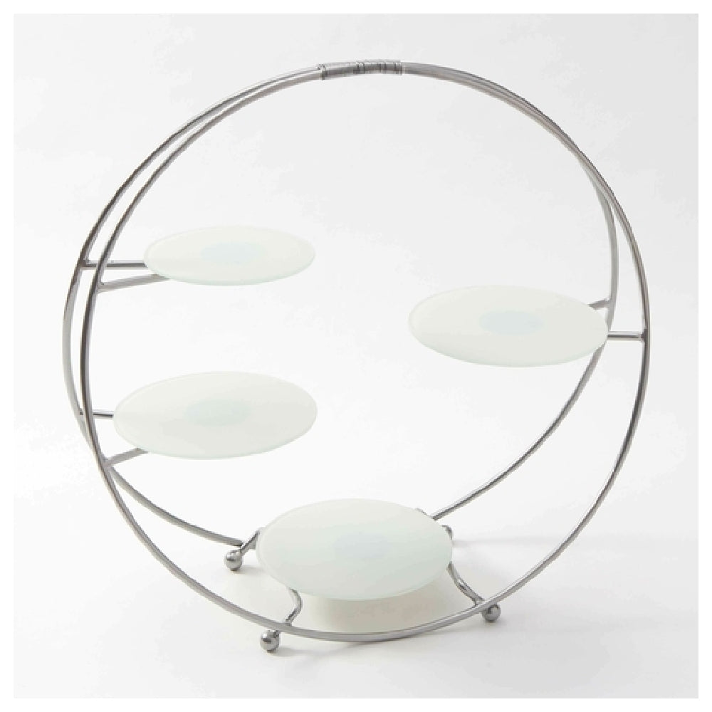 The American Metalcraft SRS4 Buffet Stand is a versatile and stylish addition to any catering or hospitality setup. This 4-tier stand measures 21-1/8 inches in length, 6-5/8 inches in width, and 21-3/4 inches in height, making it compact yet spacious enough to display a variety of dishes. It features a round design with built-in white glass plates, measuring 6 inches and 7-1/4 inches in diameter, providing a clean and sophisticated presentation surface. The stand includes a convenient carry handle, enhancing its portability for easy repositioning during events. Constructed with a durable steel frame and finished in a sleek silver tone, this buffet stand not only ensures long-lasting use but also complements a wide range of table settings and decor. It is important to note that the stand is hand wash only, ensuring that its finish remains pristine. This product's compact design and elegant presentation make it an ideal choice for venues ranging from upscale restaurants to casual catering events, offering a perfect blend of functionality and aesthetic appeal.