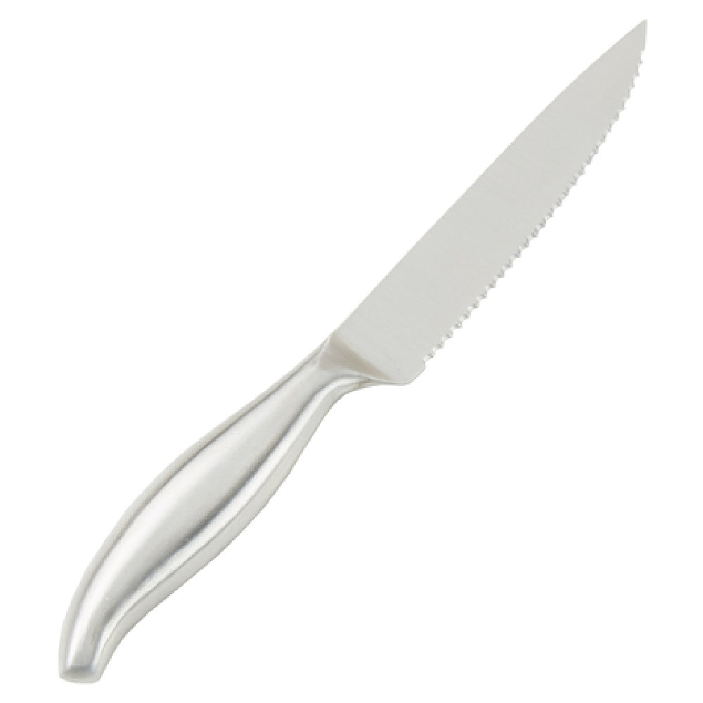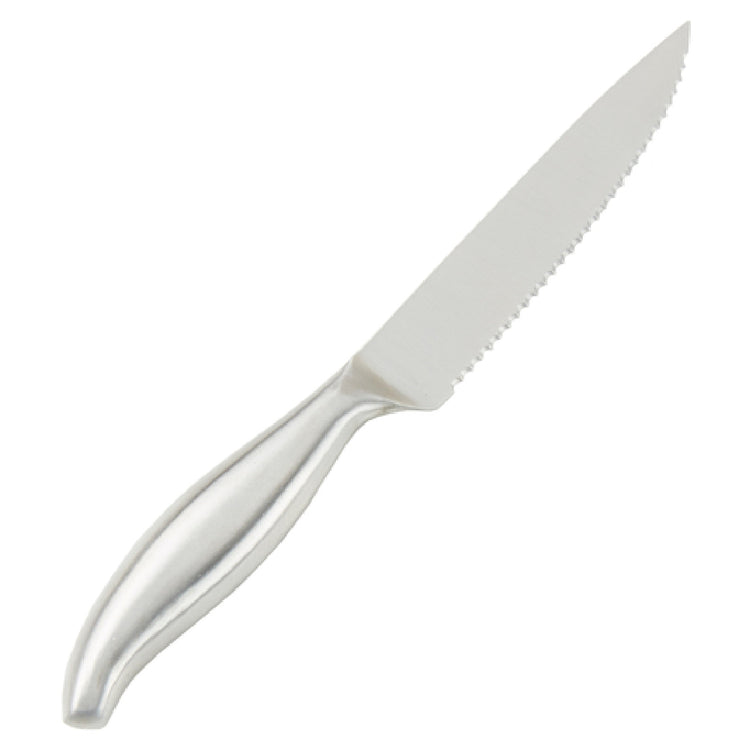 The American Metalcraft SSKNF9 Steak Knife is a meticulously crafted utensil featuring a 5-inch blade and measuring 9 inches in overall length, making it an ideal choice for both professional chefs and home cooking enthusiasts who seek precision and quality in their culinary tools. This steak knife boasts a serrated stainless steel blade, designed to effortlessly glide through various cuts of meat, enhancing the dining experience with its superior cutting performance. The satin finish adds a touch of elegance and sophistication, making it a standout piece in any cutlery collection. The stainless steel construction ensures durability and resistance to rust, promising longevity even with frequent use. This versatile steak knife is particularly beneficial for steakhouses, restaurants, and catering services that require reliable and efficient tools to meet the demands of high-volume service environments. The balance and weight of the knife are engineered for ease of use, reducing hand fatigue during prolonged use. With its precise design and high-quality materials, the American Metalcraft SSKNF9 Steak Knife is a valuable addition to any table setting, offering both functionality and style that caters to various segments within the food service industry.