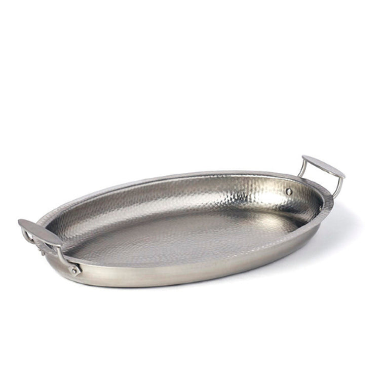 The American Metalcraft THOV19 Serving Pan is a versatile and meticulously crafted kitchen essential, with a generous capacity of 128 oz. This serving pan is designed with an 18-1/4"L x 12-3/8"W x 2"H dimension, making it suitable for a variety of culinary applications. The oval shape adds a touch of elegance to presentations, while the overall length extends to 20"L with the inclusion of handles, ensuring ease of transport and handling. Constructed from high-quality stainless steel, this serving pan boasts a hammered finish, which not only enhances its aesthetic appeal but also adds durability and resistance to wear. The THOV19 Serving Pan is ideal for use in professional kitchens, catering services, and upscale restaurants where durability and style are paramount. Its robust construction and sizeable capacity make it a practical choice for serving a range of dishes, from appetizers to main courses. The American Metalcraft THOV19 Serving Pan is an exemplary piece for any food service operation looking to combine functionality with a sleek design, ensuring that it stands out in both utility and presentation.