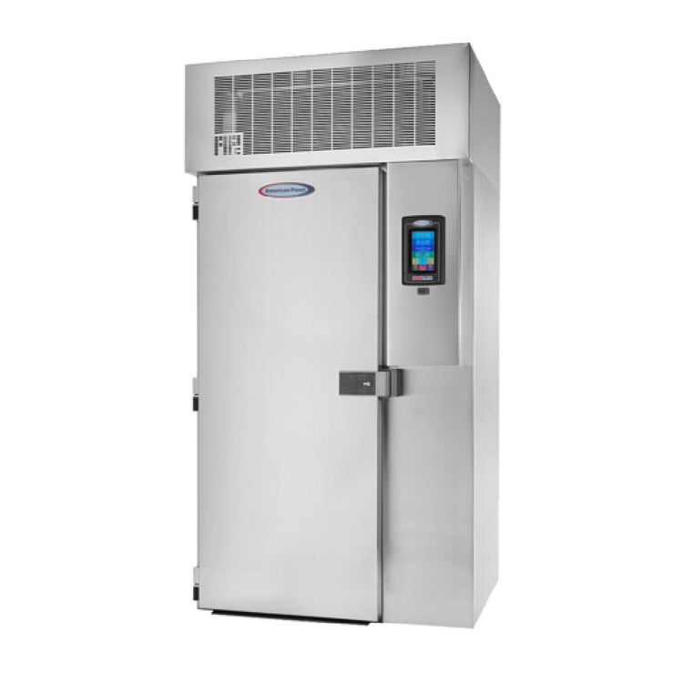 The American Panel AP20BCF200-3 HURRiCHiLL™ Blast Chiller/Shock Freezer Roll-in is an advanced self-contained unit designed for efficient cooling and freezing in professional kitchen environments. This versatile appliance accommodates one mobile rack (not included) with a capacity for either twenty 12" x 20" x 2.5" pans or ten 18" x 26" pans (pans not included), offering flexibility for various culinary operations. It boasts an impressive blast chill capacity, cooling 200 lbs. from 160°F to 38°F in just 90 minutes, and a freeze capacity, reducing 120 lbs. from 160°F to 0°F within 240 minutes. The unit features a user-friendly 7" LCD touch screen controller with Quick Start and A La Carte functionalities, streamlining operations for busy kitchen staff. Equipped with one heated food probe, the chiller operates on 208v/60/3 phase electrical input, drawing 19.5 amps and requires connection to a 30-amp circuit. With a 2-1/2 HP motor, the appliance is designed with a durable stainless steel interior and exterior, ensuring longevity and resilience in demanding environments. The American Panel AP20BCF200-3 is UL CLASSIFIED EPH, ANSI/NSF, and cUL certified, ensuring compliance with industry standards, making it a reliable choice for restaurants, catering services, and large-scale food production facilities. (PAST MODELS- AP20BCF175-3)