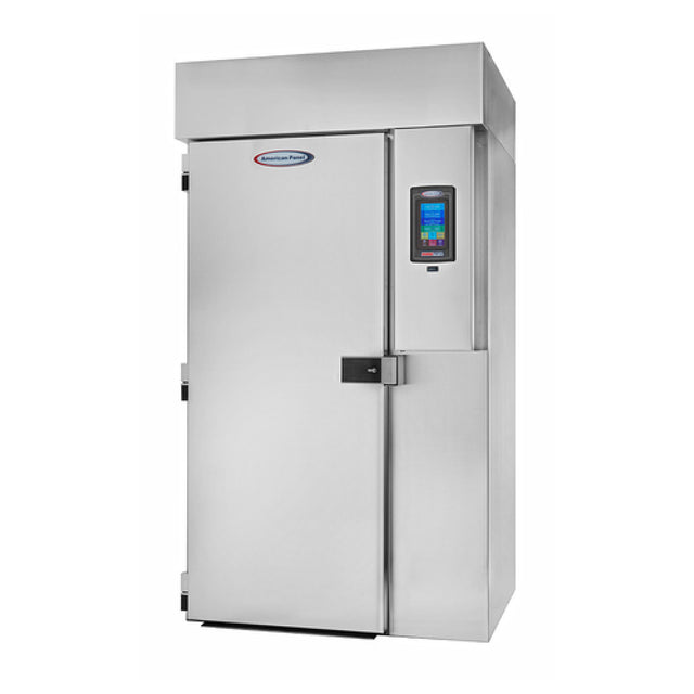The American Panel AP24BC250-3 HURRiCHiLL™ Blast Chiller Roll-in Remote Refrigeration is a high-capacity solution designed for commercial kitchens and food service operations seeking efficient refrigeration capabilities. This unit accommodates a mobile rack that can hold up to 24 pans measuring 12" x 20" x 2.5" or 12 pans measuring 18" x 26", providing significant storage flexibility. It boasts an impressive blast chill capacity of 250 lbs., rapidly reducing temperatures from 160°F to 38°F within 90 minutes, ensuring food safety and quality. The chiller is operated via a 7" LCD touch screen controller, featuring Quick Start and A La Carte functionality for versatile and user-friendly operation. An included food probe allows for precise temperature monitoring. Constructed with both a stainless steel interior and exterior, the AP24BC250-3 ensures durability and ease of cleaning. It is UL CLASSIFIED EPH and meets ANSI/NSF and cUL standards, attesting to its high compliance with safety and sanitation standards. This blast chiller's remote refrigeration capability allows for flexible installation options, making it a practical choice for various settings within the food industry, from large-scale catering services to industrial kitchen environments, where rapid chilling is essential.