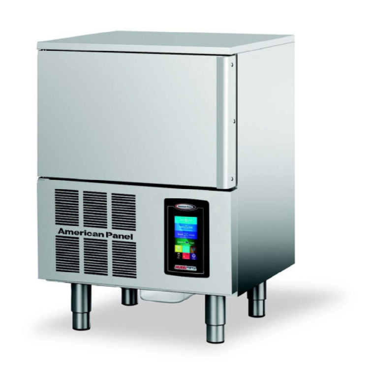 The American Panel AP3BCF30-1-TS HURRiCHiLL™ Blast Chiller/Shock Freezer Reach-In is an advanced cooling solution designed for professional kitchens requiring efficient and rapid chilling and freezing capabilities. This undercounter unit has a self-contained design and accommodates up to three pans, each measuring 12" x 20" x 2.5", allowing for versatile use in various culinary settings. It boasts a blast chill capacity of 36 lbs., efficiently reducing temperatures from 160°F to 38°F within 120 minutes, and a freeze capacity of 18 lbs., achieving temperatures from 160°F to 0°F within 240 minutes. The chiller is equipped with a 7" touchscreen control panel, providing user-friendly operation, and a quick-start button for immediate functionality. Enhanced by a single food probe, the AP3BCF30-1-TS ensures precise temperature monitoring. Its durable stainless steel interior and exterior, complemented by 6" stainless steel legs, promise longevity and stability. The unit is powered by a 3/4 HP motor and features an automated defrost system for optimal performance. Certified by cULus and UL EPH Classified, this blast chiller/shock freezer represents a significant asset for food service operations, underlining its commitment to safety, quality, and efficiency in demanding kitchen environments.