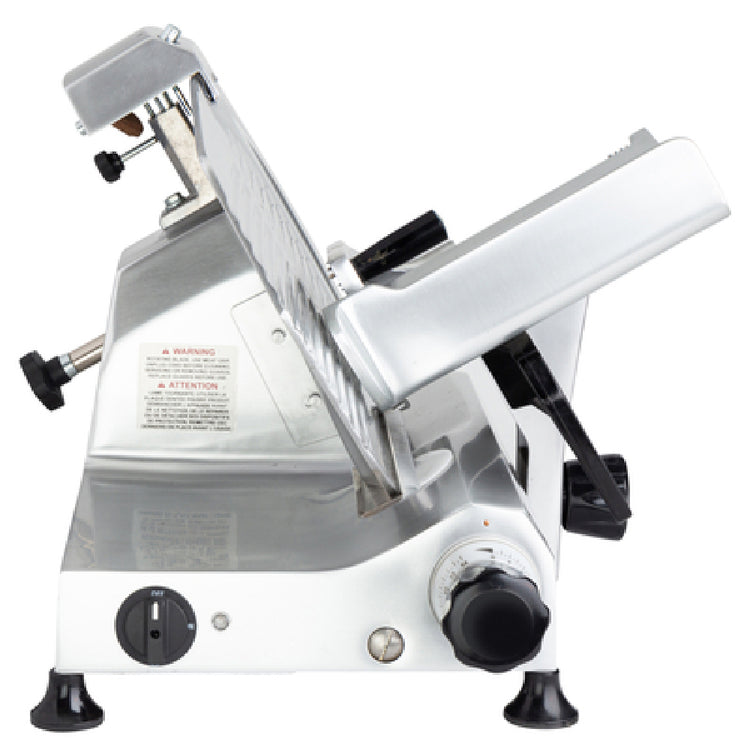 The AMPTO 250E Meat Slicer Medium Duty Manual is a precision-engineered appliance designed for both commercial kitchens and deli counters that demand consistent slicing performance. Featuring a 10-inch stainless steel blade, this slicer is capable of producing slices up to 5/32 inches in thickness, making it suitable for a wide range of meats. The unit boasts a gravity feed system and is powered by a robust belt-driven mechanism, ensuring efficient operation. The slicer's slicing capacity of 8.6 x 7.48 inches accommodates various sizes of meat cuts, enhancing its versatility. Constructed with anodized aluminum, the 250E is not only durable but also easy to clean and maintain. A built-in sharpener ensures that the blade remains sharp for precise slicing over time. With a 1/3 horsepower motor operating at 120 volts and 60 Hz in a single-phase configuration, this meat slicer is ETL and ETL-Sanitation certified, guaranteeing compliance with safety and sanitation standards. Made in Italy, the AMPTO 250E embodies Italian craftsmanship and engineering excellence, making it an ideal choice for small to medium-sized food service establishments seeking reliability and quality in their meat slicing operations.