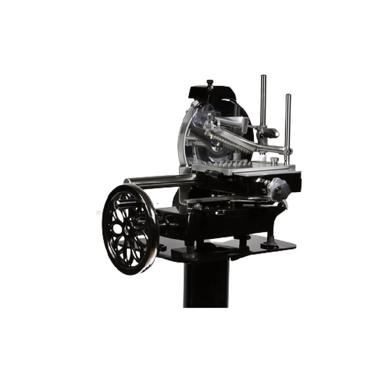 The AMPTO 300 VOLANO Volano Flywheel Slicer Manual 12" Blade is a meticulously crafted slicing tool, perfect for culinary professionals and enthusiasts seeking precision and quality. It features a manual flywheel operation complemented by a substantial 12-inch blade, allowing for cutting thickness adjustments from 0 to 3/32 inches, thus ensuring versatile slicing options for different types of meats and cheeses. The built-in sharpener ensures that the blade maintains its sharpness for consistent performance over time. Safety is enhanced with a self-locking arm and a fixed ring guard, providing users with a secure slicing experience. Constructed from a robust combination of aluminum, steel, and stainless steel, this slicer is both durable and resilient, promising longevity and reliability. The elegant baked enamel finish in a sleek black color adds aesthetic appeal while maintaining easy-to-clean surfaces. Certified by ETL for sanitation, this slicer meets rigorous hygiene standards, making it suitable for professional kitchens and demanding environments. Proudly made in Italy, the AMPTO 300 VOLANO embodies a blend of traditional craftsmanship and modern technology, making it a valuable asset for butcheries, delicatessens, and gourmet kitchens that require high-performance slicing equipment.